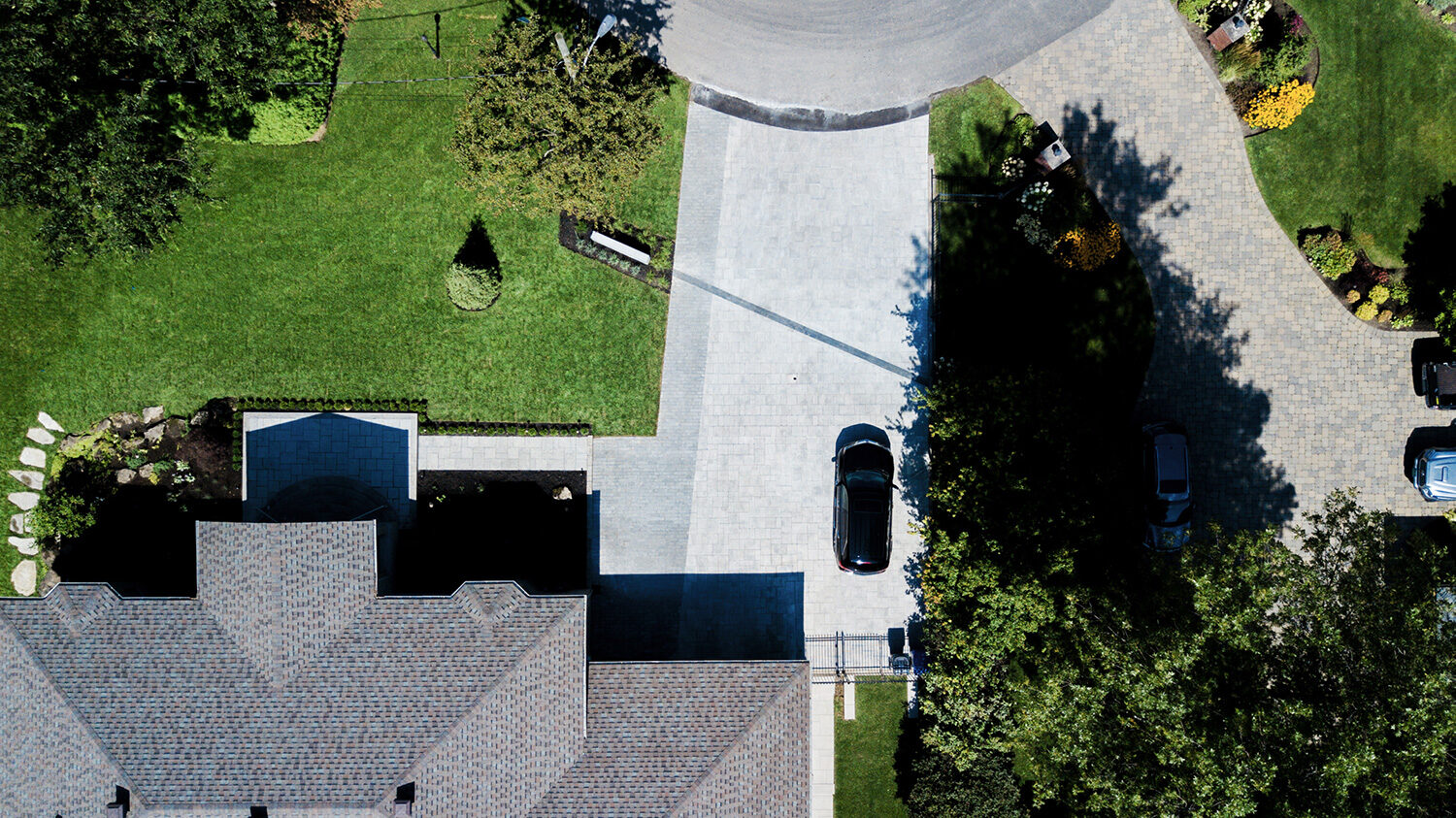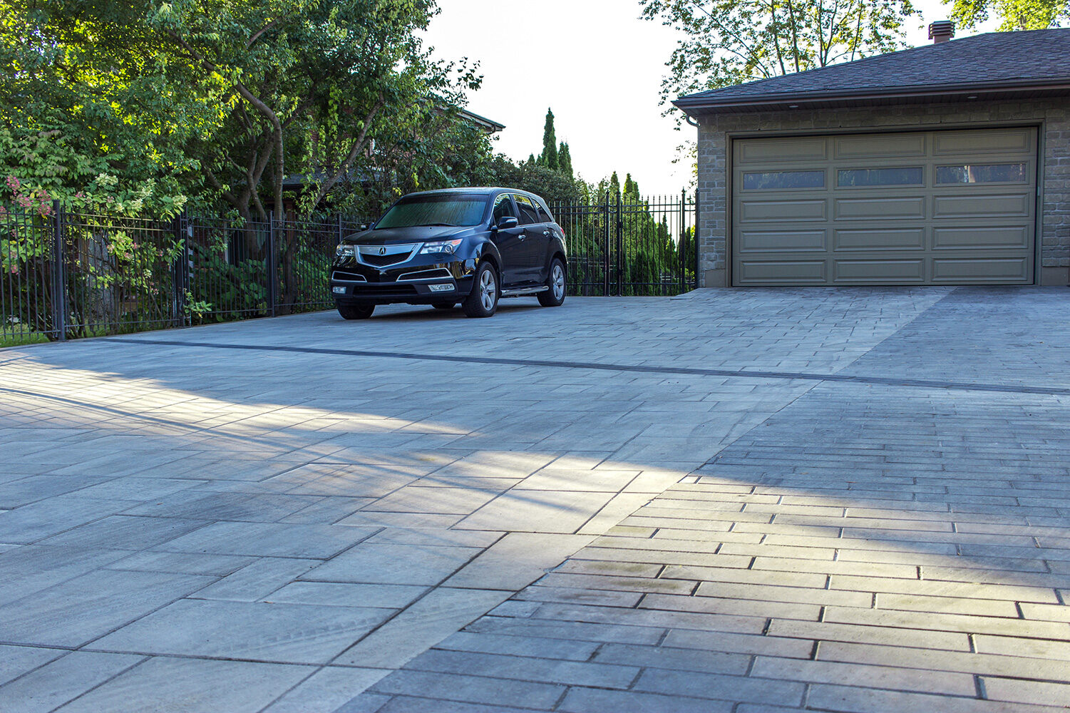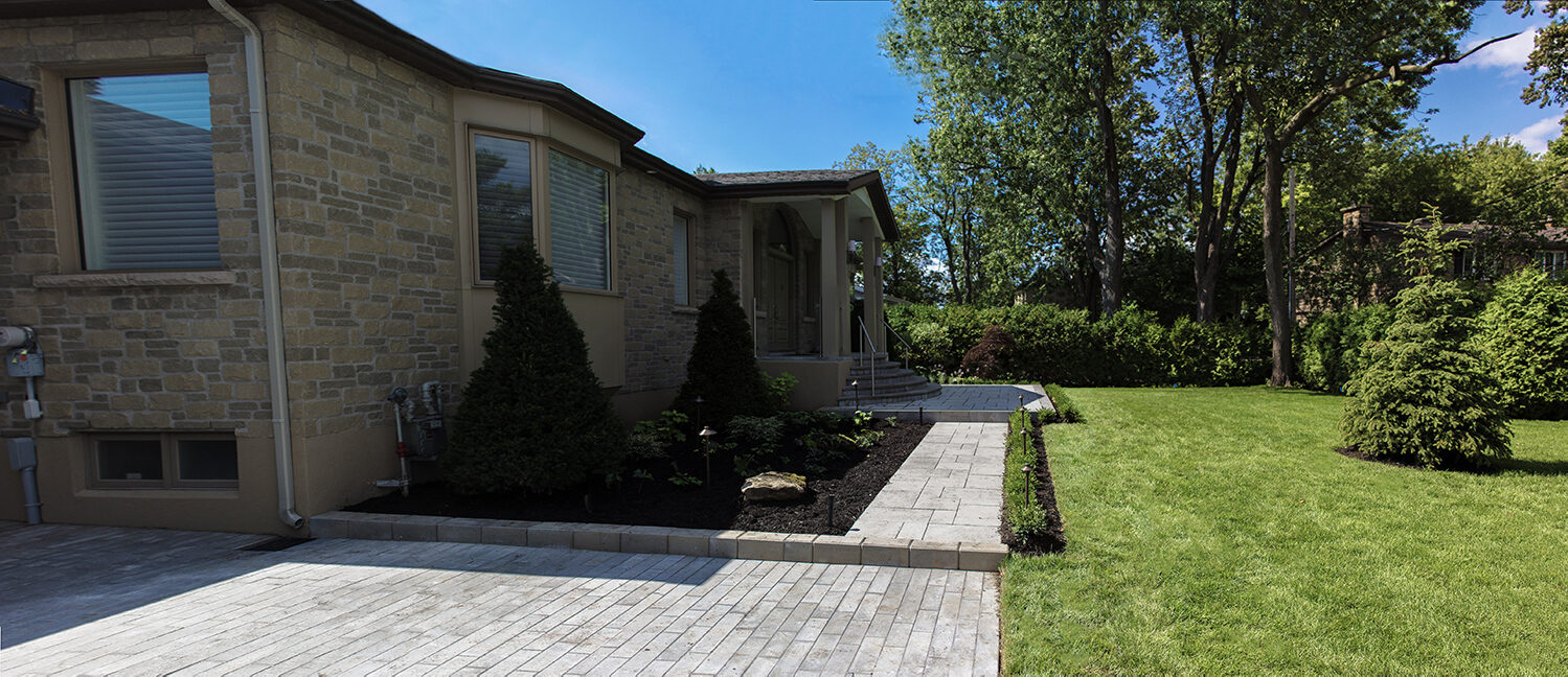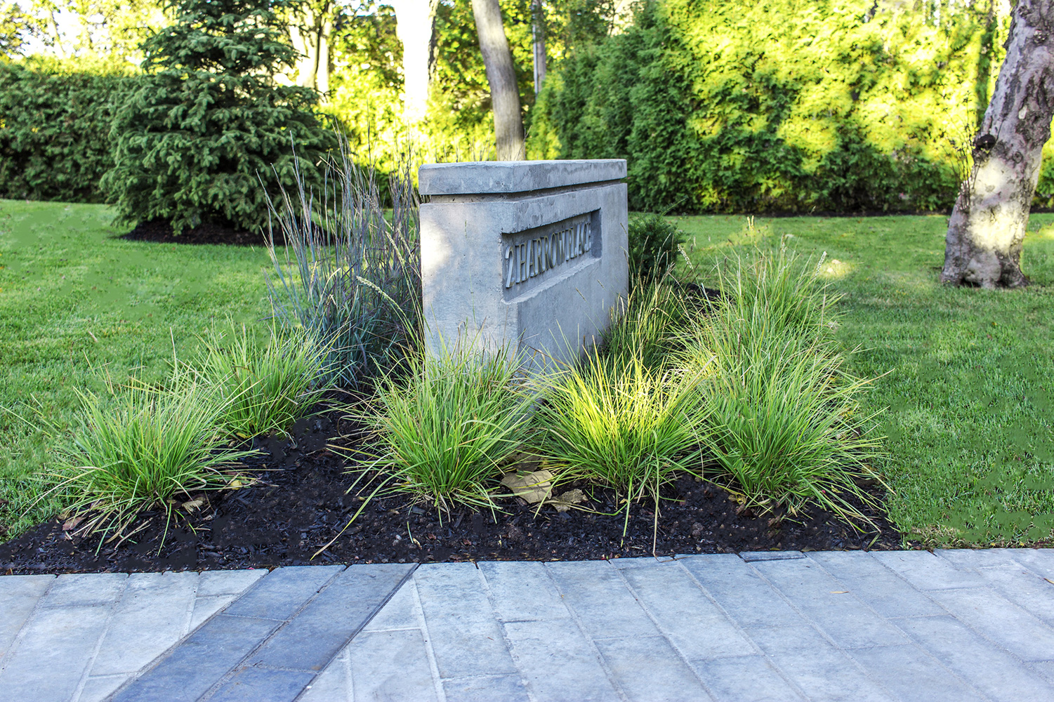 Our team designed a new paving pattern for the driveway to add interest and break up the large expanse of paving into a walkway and parking areas.A cast in place concrete wall was created to display the civic address. The wall is set at an angle to the driveway and is accentuated by a contrasting banding that runs through the driveway.