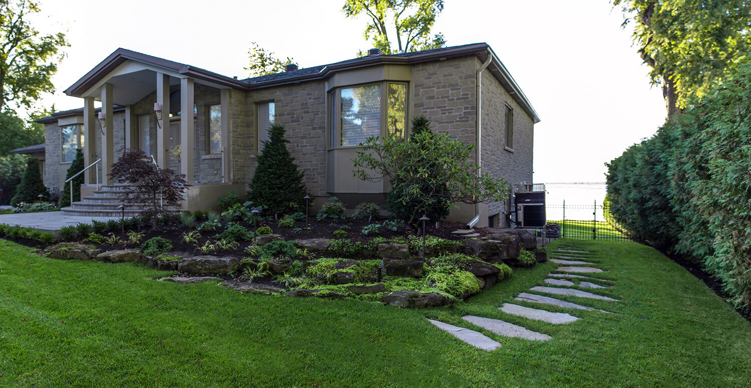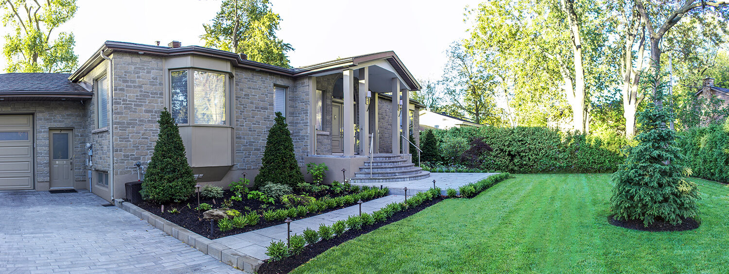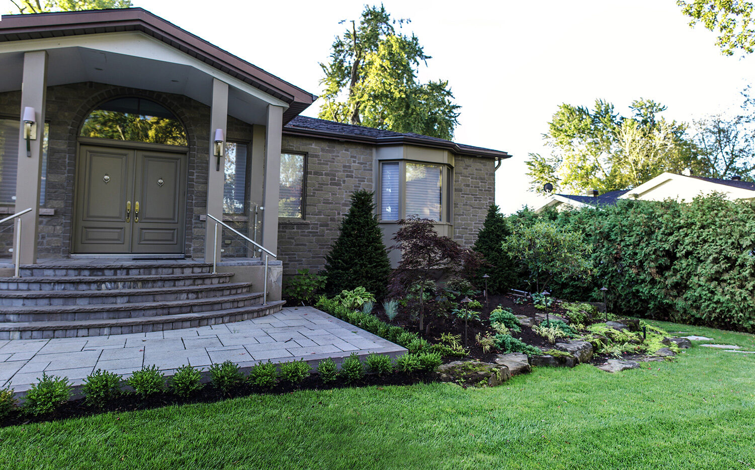 The scale of the walkway and landing at the base of the front steps left the front entrance feeling very open. A specimen Japanese Maple tree was planted at the end of the walkway, creating a focal point for visitors. As the planting at the entrance mature, they will create additional privacy from the street.