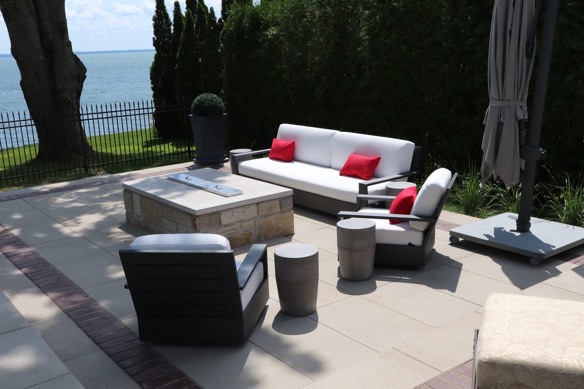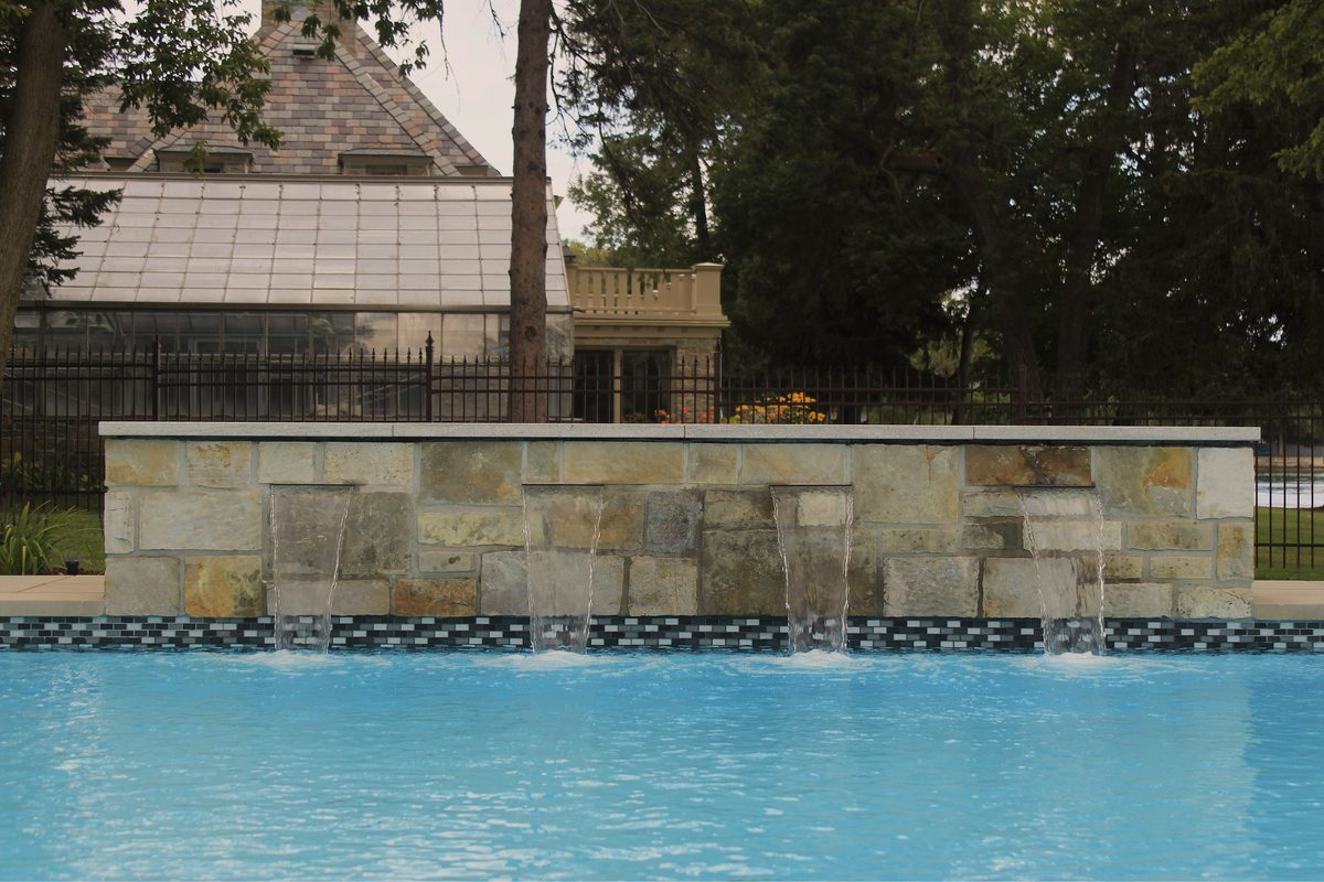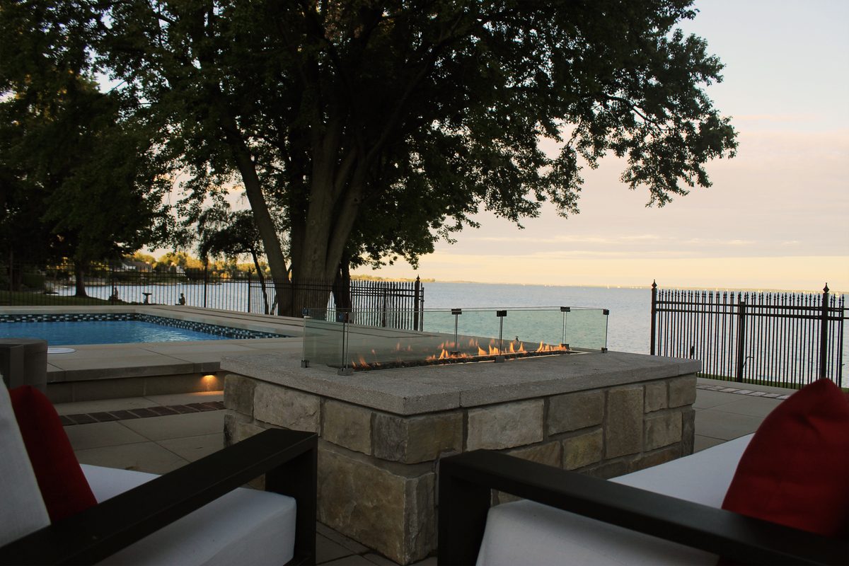 In order to tie in with the beautiful stone of the house, we used St-Marc’s stone when building the custom-made fireplace and water feature.