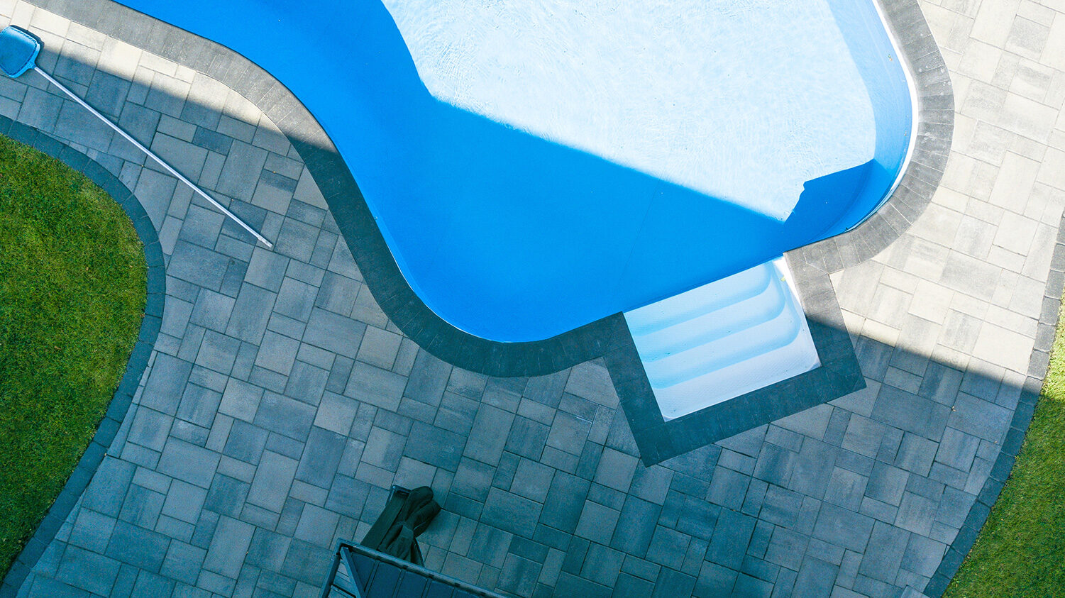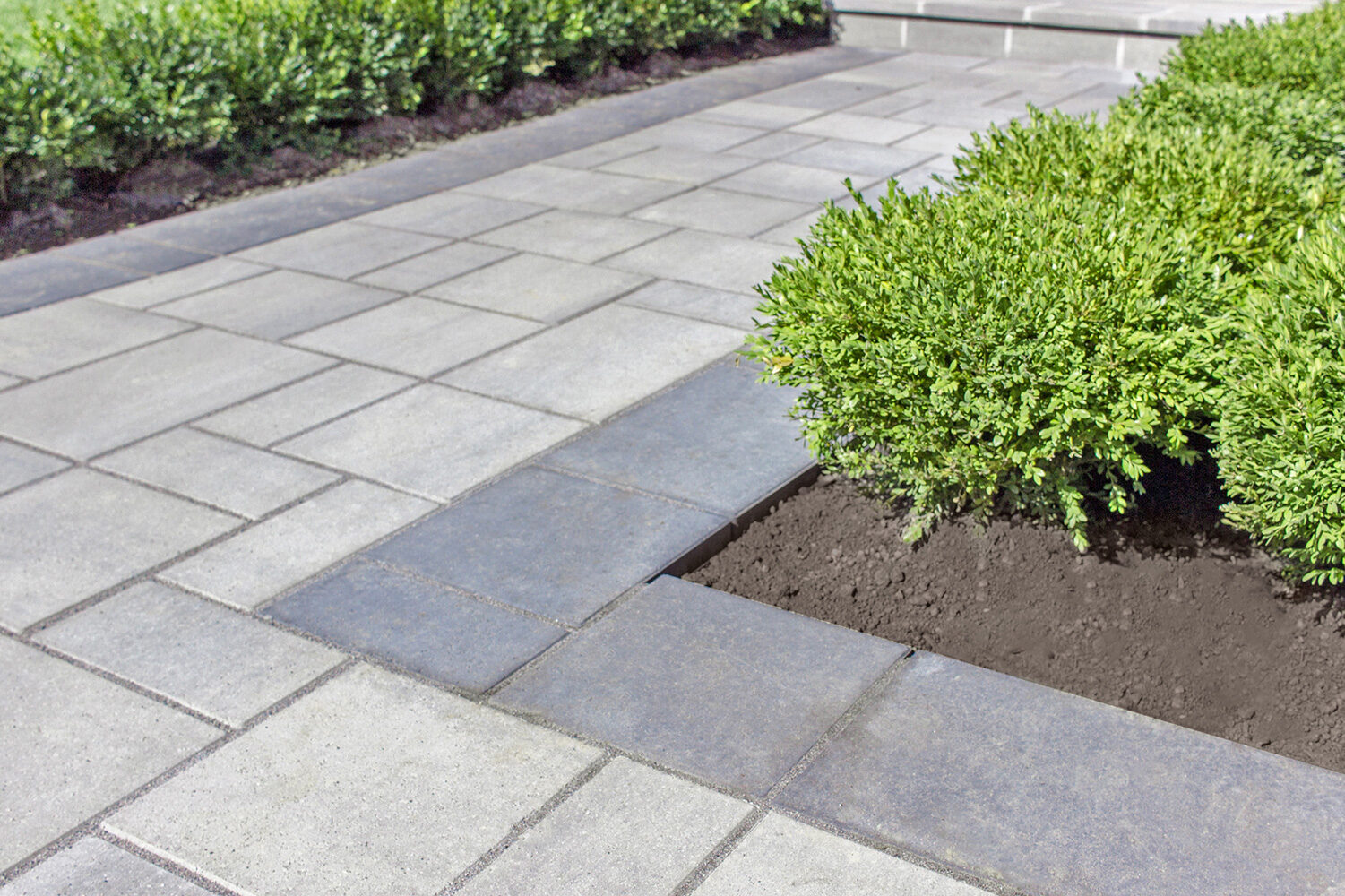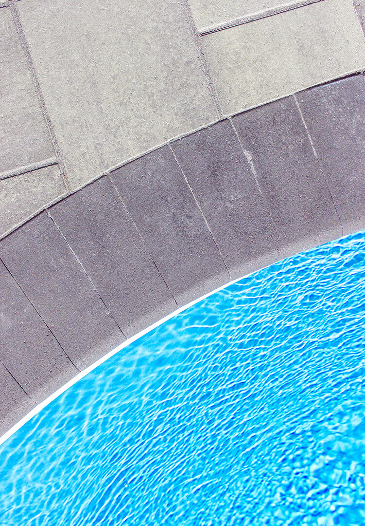 The colors for the paving materials were selected based on future plans for renovation of the home’s exterior. The existing pool required a curvilinear layout of the patio and pool deck. The front entrance was modernized with large paving stones and an angular layout. The existing concrete front porch was re-poured to the correct height to allow for the installation of stonework to match the walkway. Using the same paver colors and pattern help to tie the two spaces together. Block planting of boxwood hedges adds to the modern look.