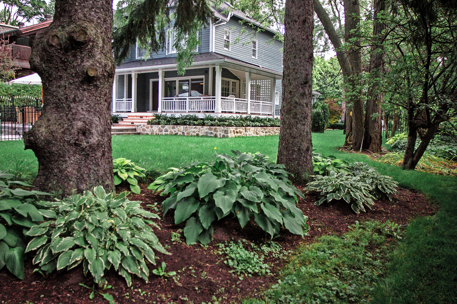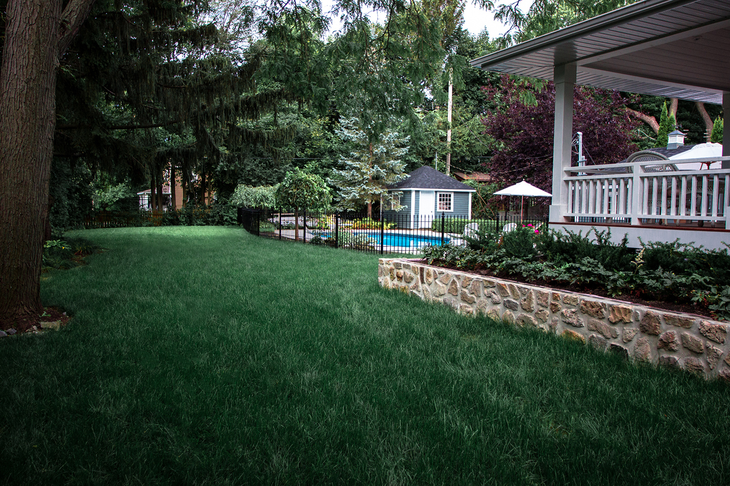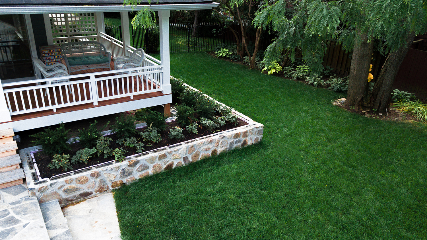 Thus, a raised planter, built out of natural stone, was recommended to fill the large South side of the property. This planter box followed with the build of the wrap-around back porch and added to the tier-look of the backyard.