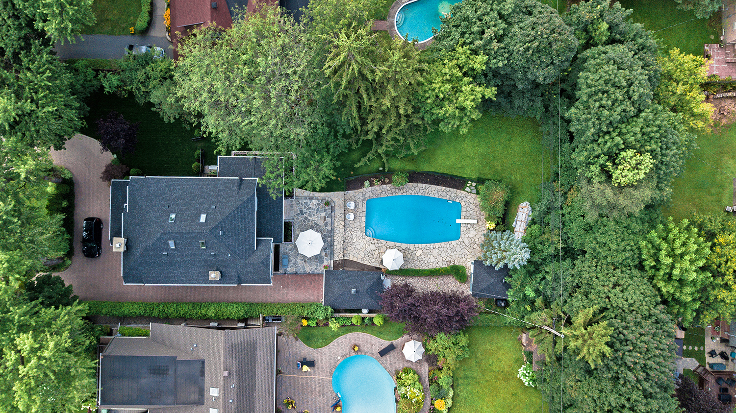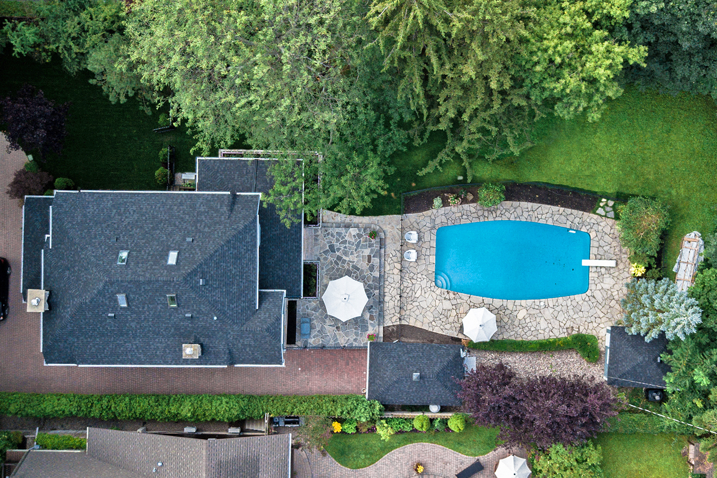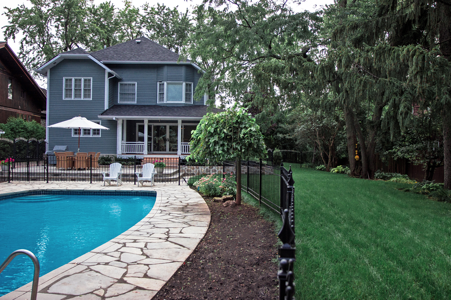 Our designers went straight to work on dreaming up a two-tier flagstone patio, in order to break up the backyard landscape and provide a separate lounge location away from the pool deck. As our clients took a great amount of pride in their gardening, we wanted to allow them more room to do so.