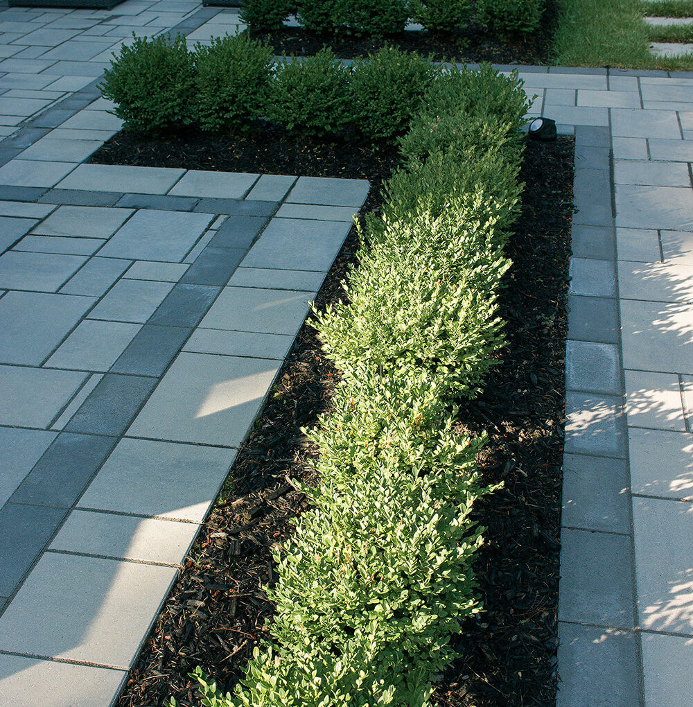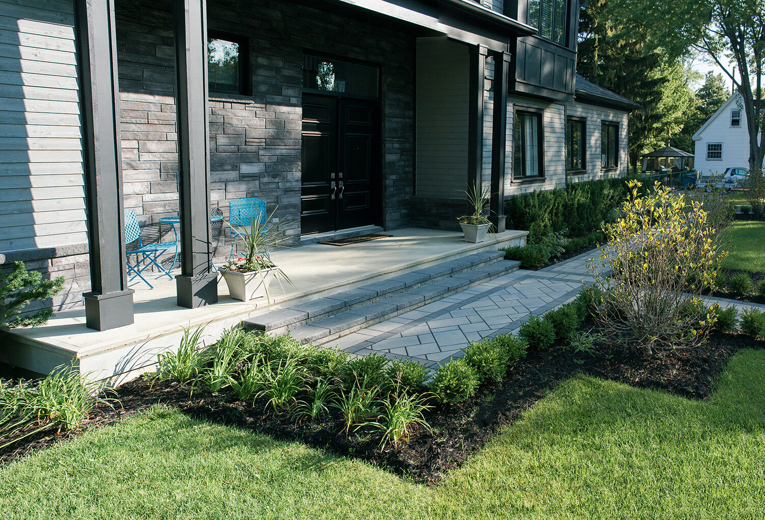 The front walkways needed to be large enough to suit the house and it was decided to add a walkway to the street, keeping in the tradition of the neighborhood. The stonework is far from monotonous with accent bandings and changes in pattern used to highlight its layout.