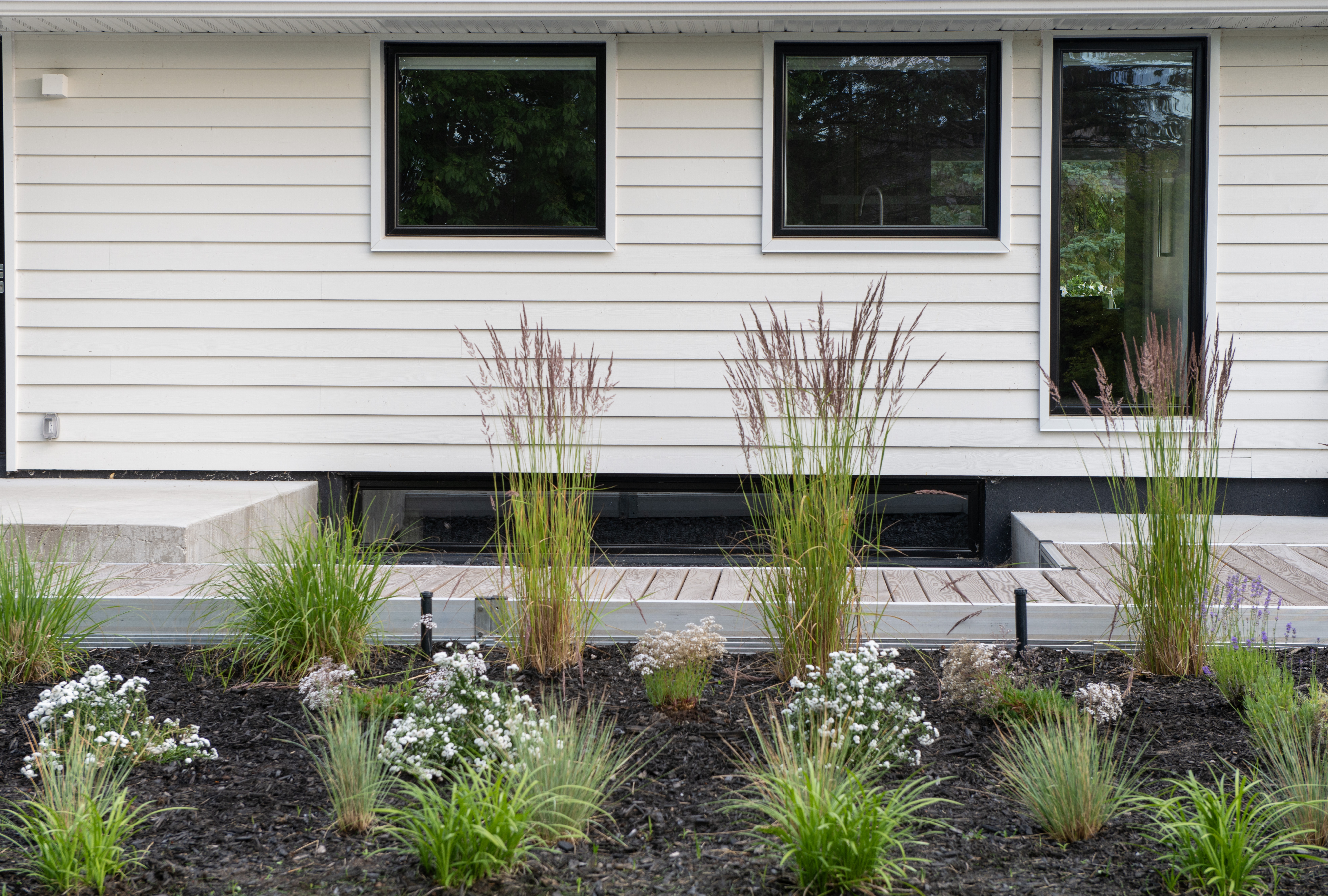 In the backyard, modern concrete installations provided a versatile surface, while an irrigation system was implemented to maintain healthy plant life. Window wells were installed to improve drainage and safety, and a drywell was constructed in the back corner to manage water flow and prevent flooding.