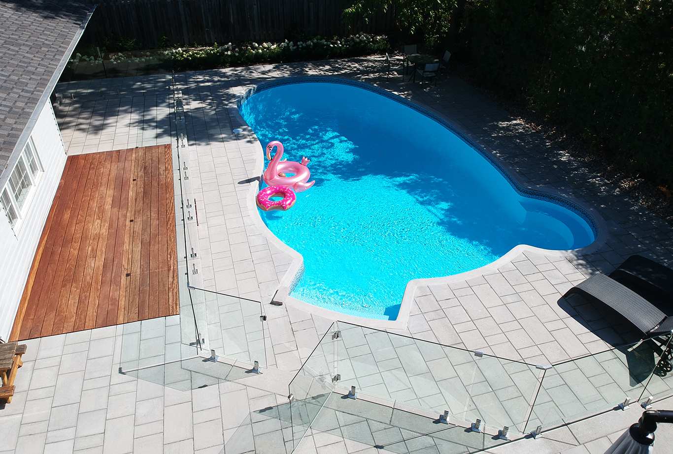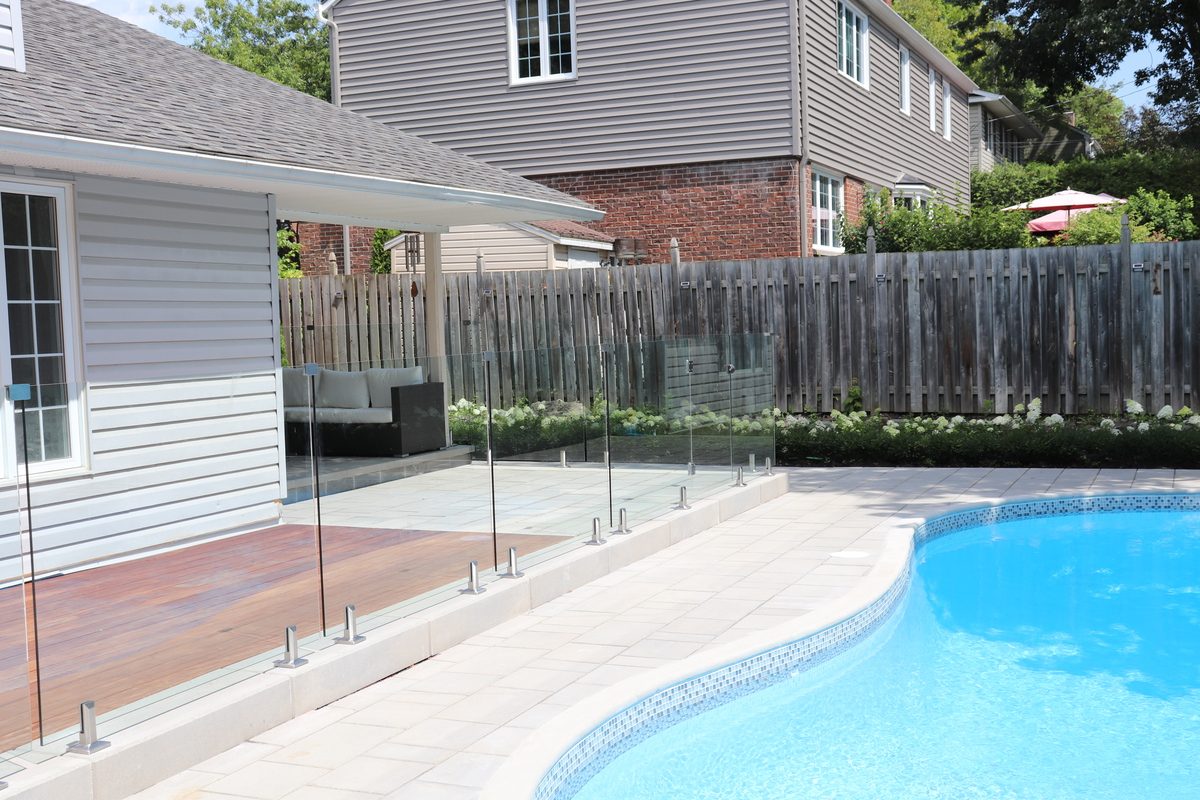 For safety and to continue with the modern theme, we installed a show-stopping glass fence around the pool. To bring in some warmth, an ipe wood decking inlay was built into the patio and living space.