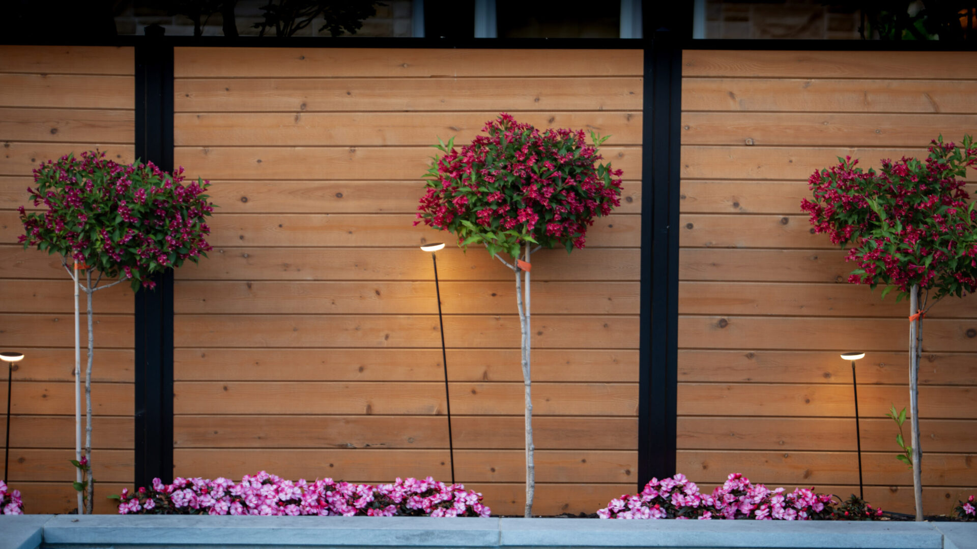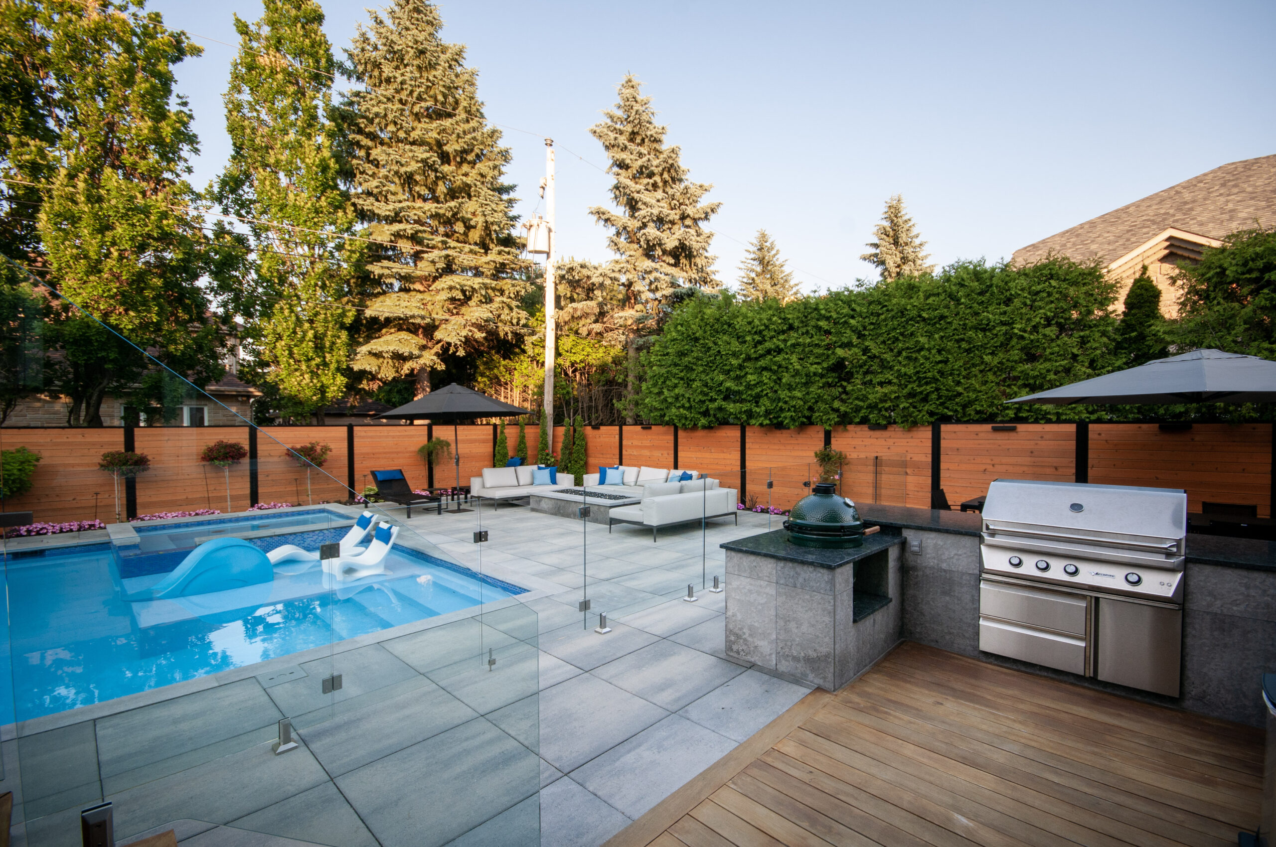 A custom gas fire pit was built for the second living space to enjoy on warm and cool evenings from spring to fall. The property fence was made of ornamental cedar wood which gives a gorgeous luxury look. The fence was complemented with elements such as the IPE BBQ landing, stairs to the house and garden boxes throughout the property.