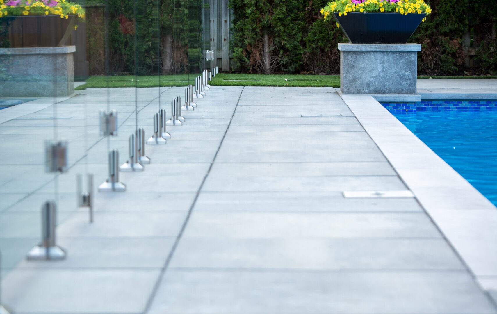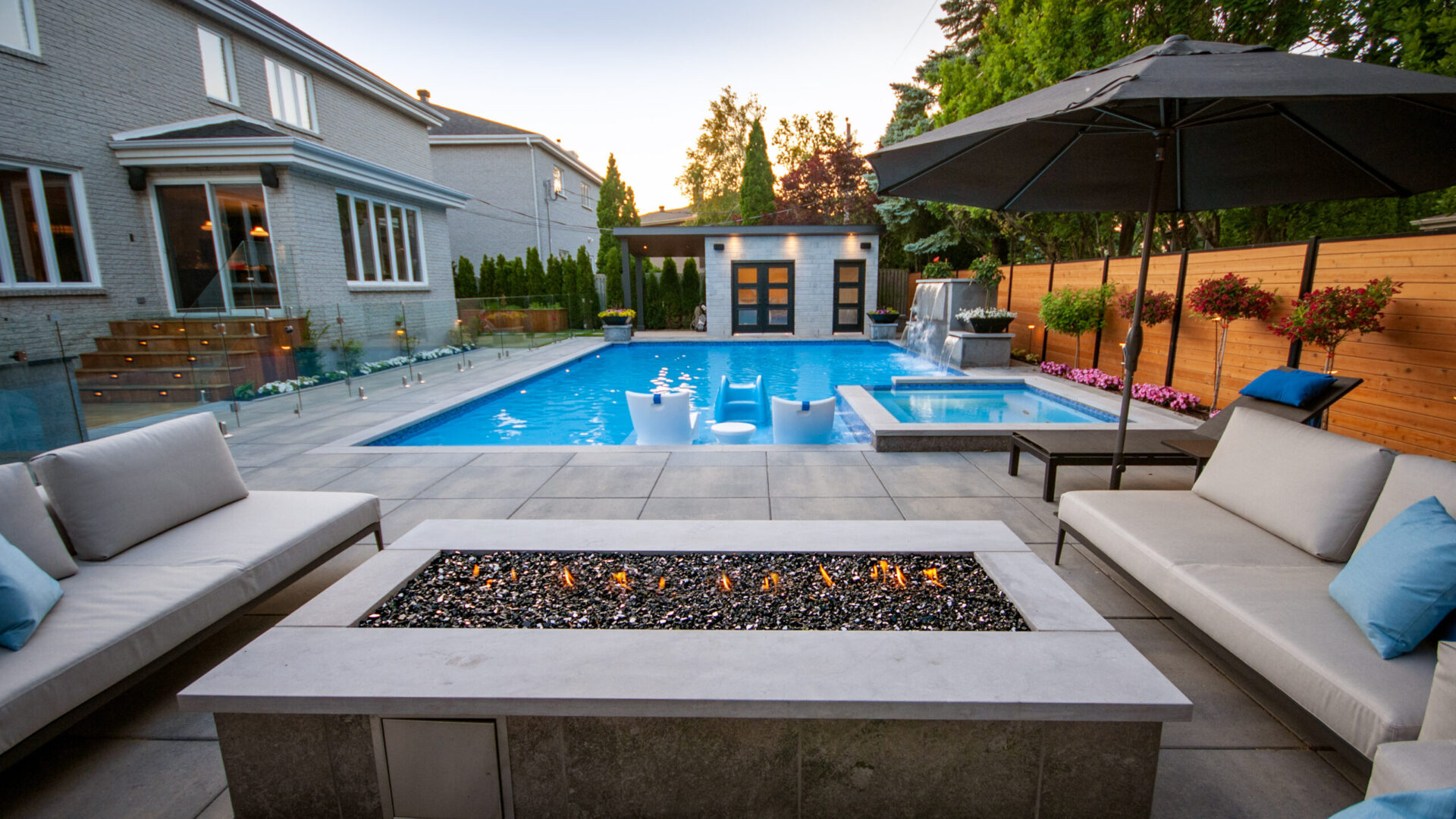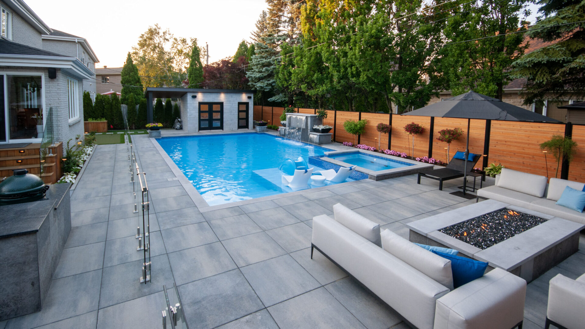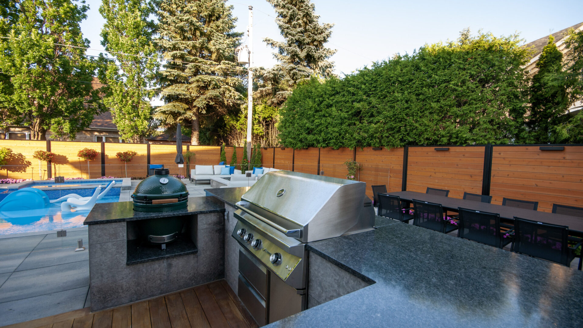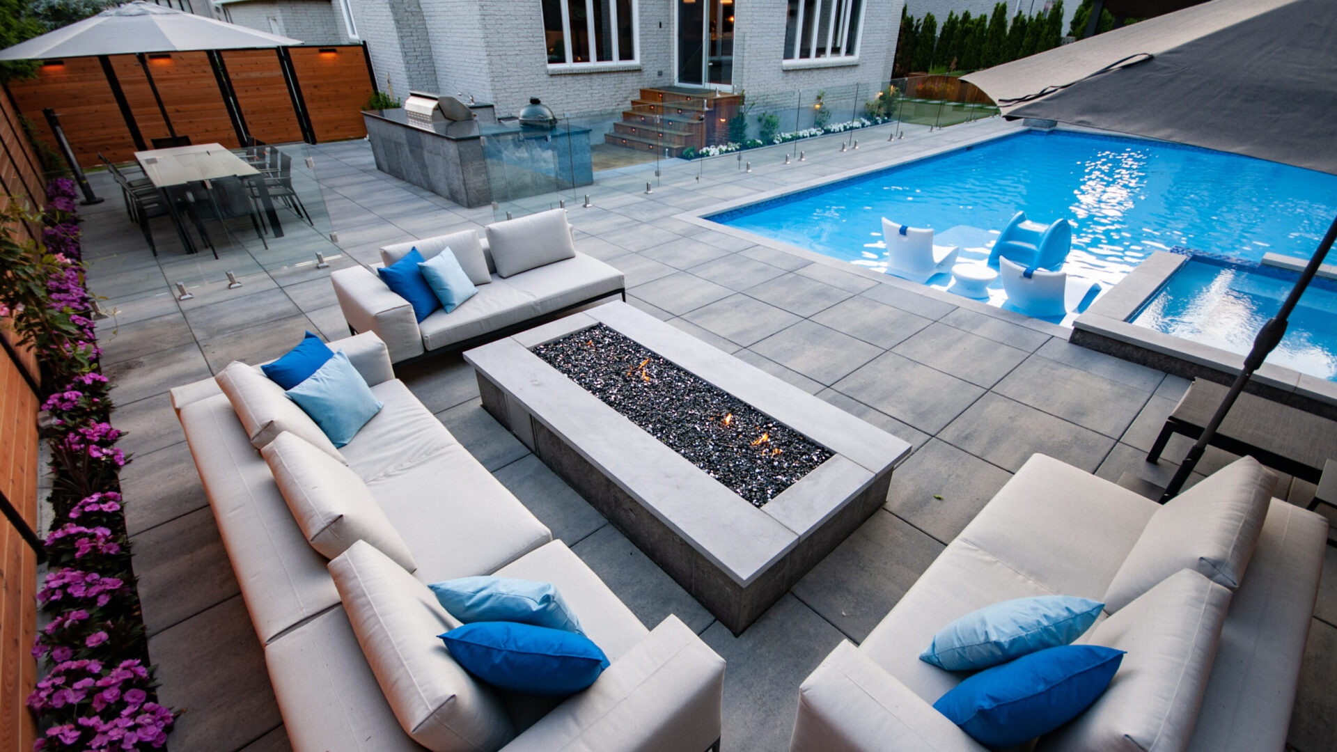 An outdoor kitchen area was custom-built using galvanized steel, veneered with royal blue natural stone and topped with a beautiful black granite countertop. We installed the latest components on the market for outside cooking, including a BBQ, smoker and sink. Designed for ample cooking and serving space, and built in a central location to easily host. The majority of the outdoor living area was paved with Rinox Proma Quadra 32″ × 32″ in ash charcoal to give a big open feel to the yard.