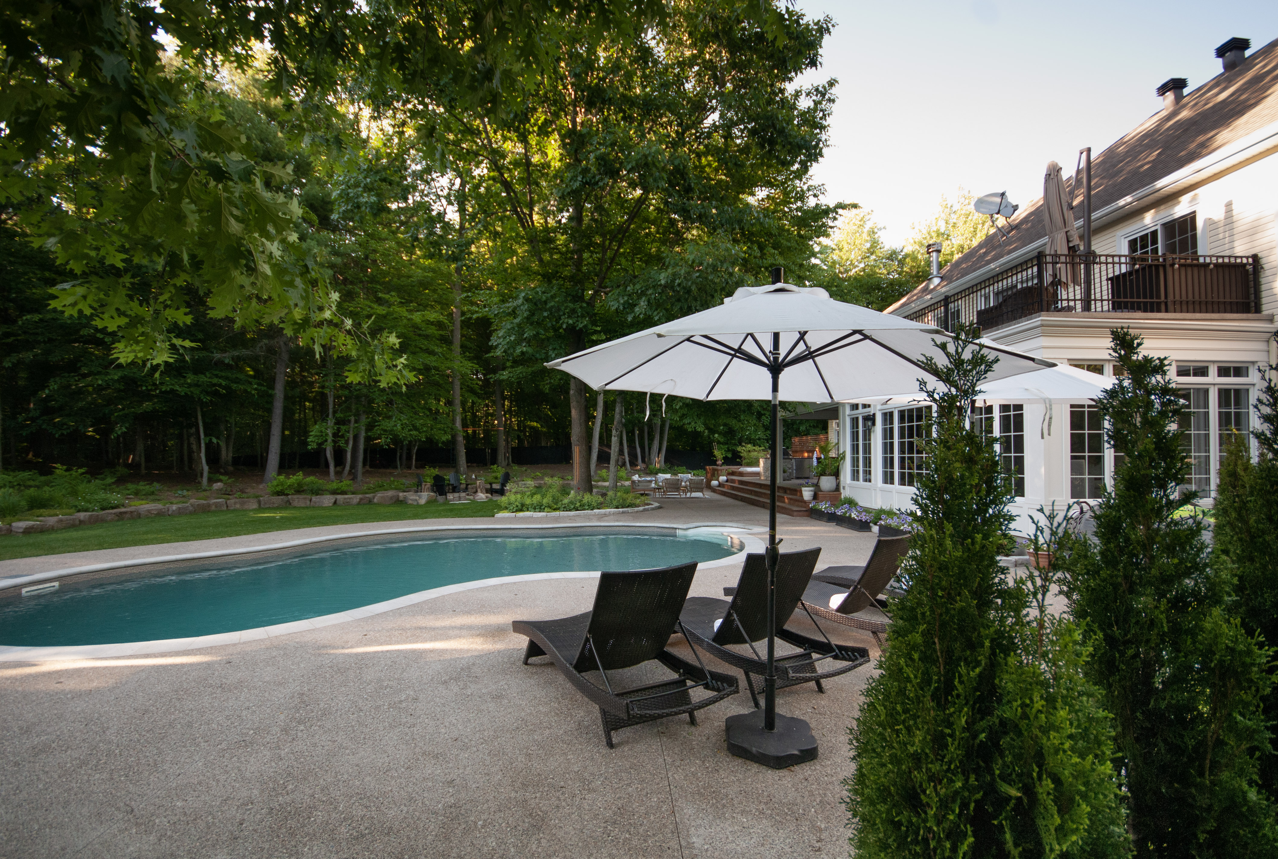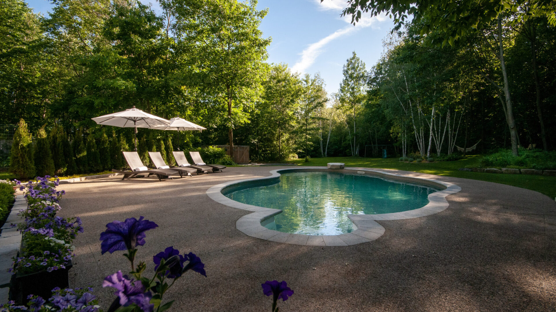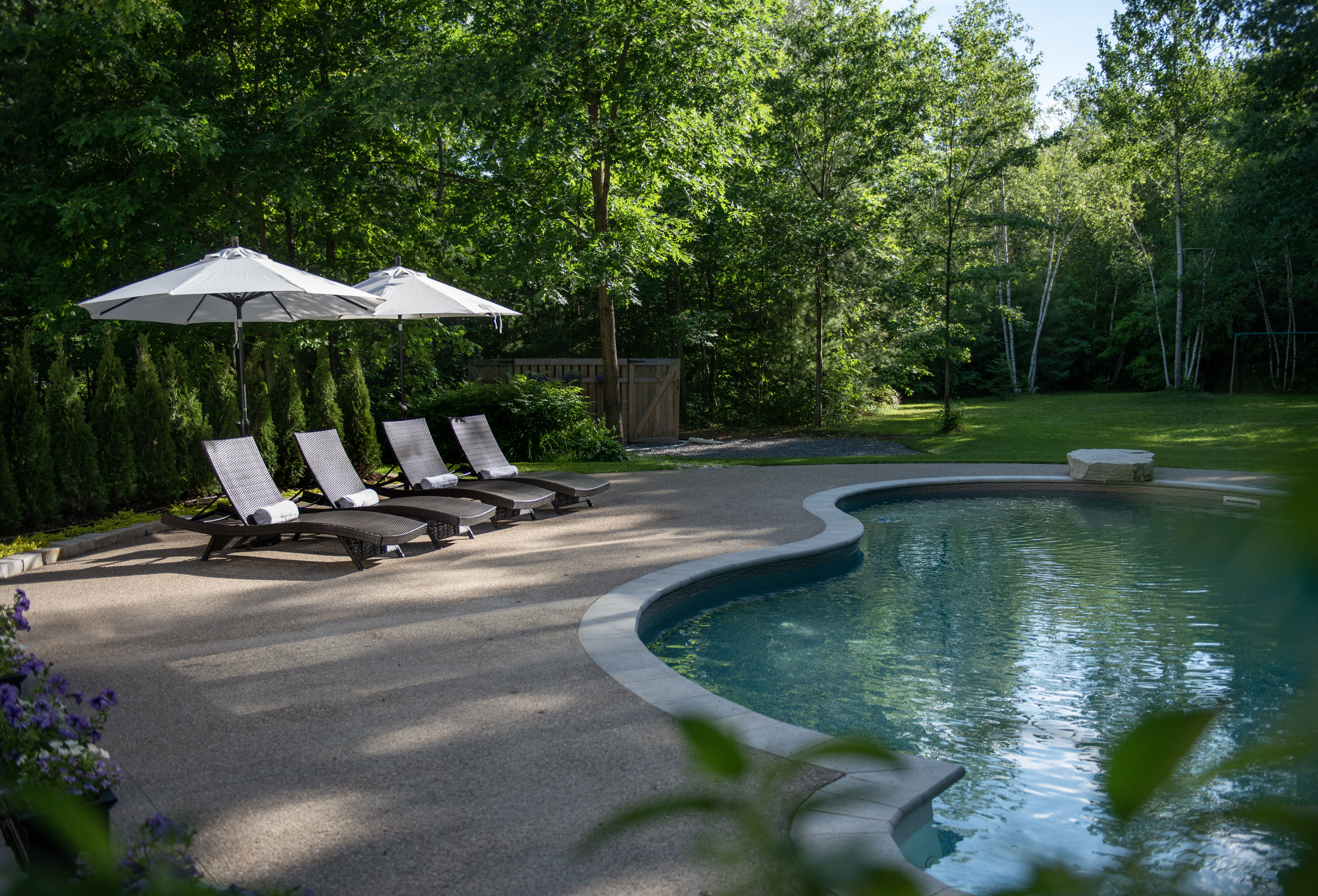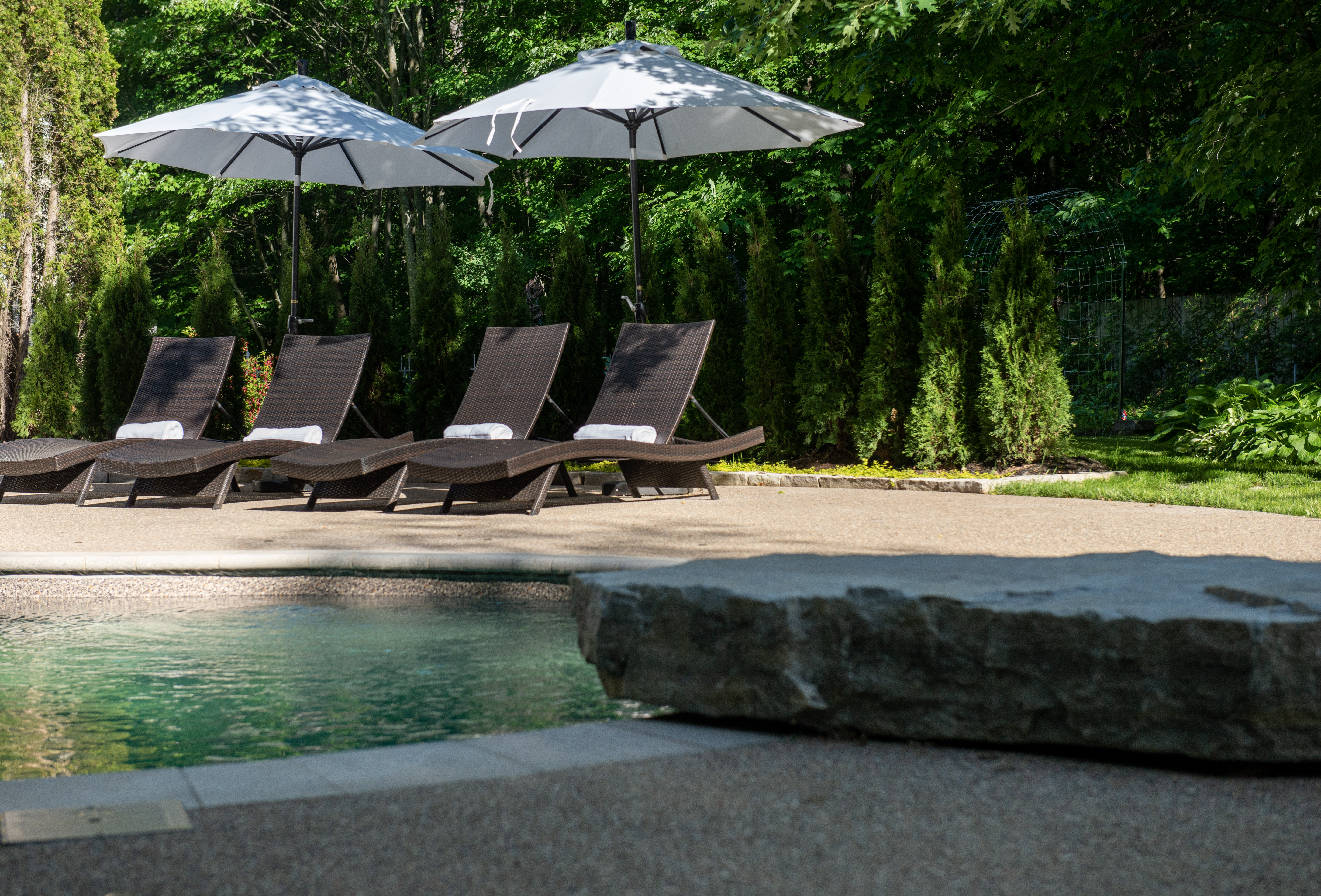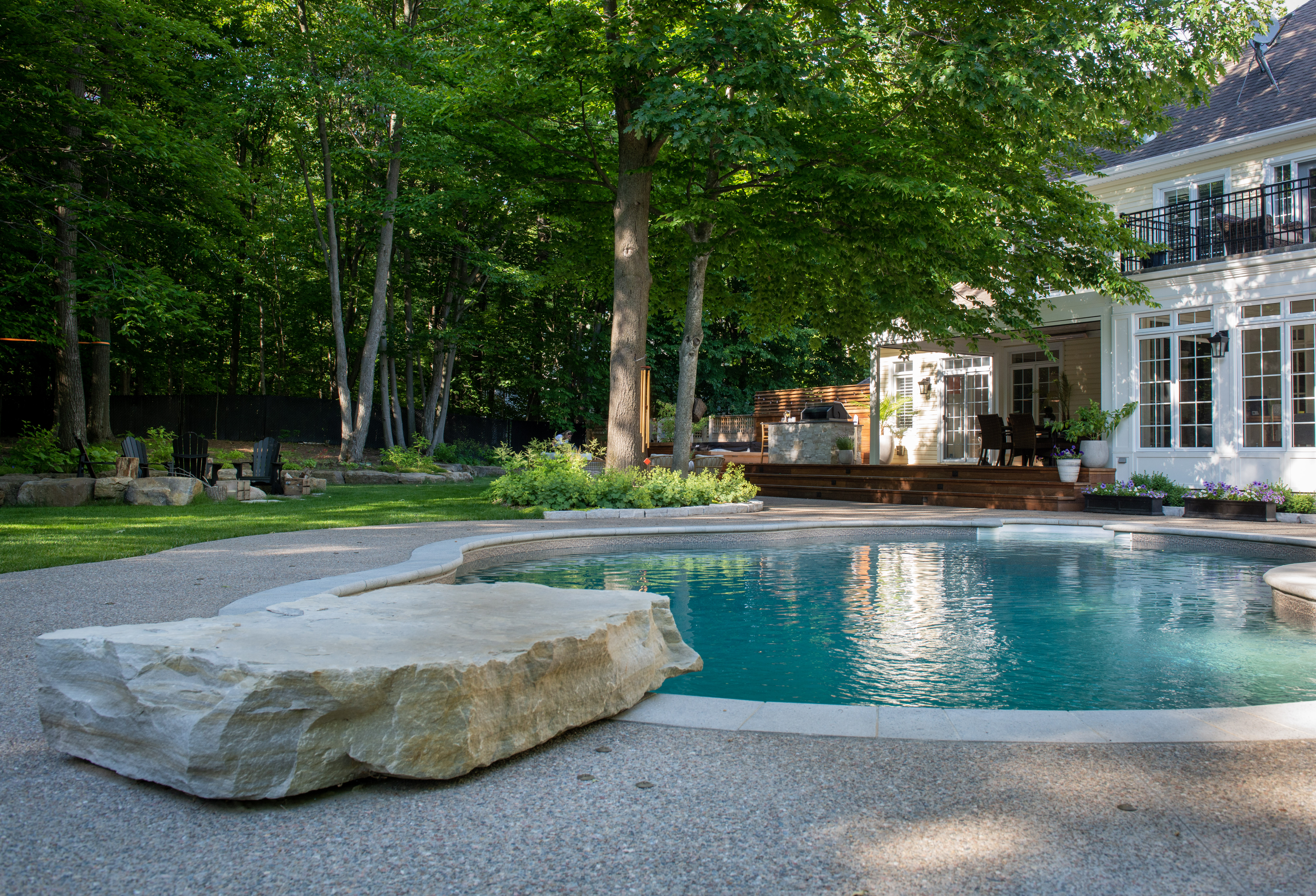For the pool area, we built and poured an exposed aggregate concrete pool deck; a long-lasting, low maintenance product yet very striking to the natural eye. We also incorporated a natural stone diving board that we hand-selected from a local Quebec quarry.