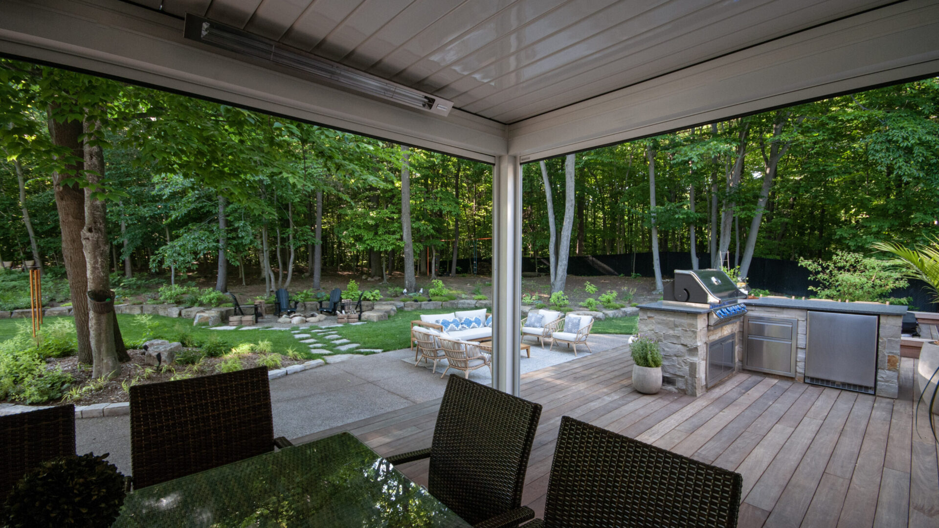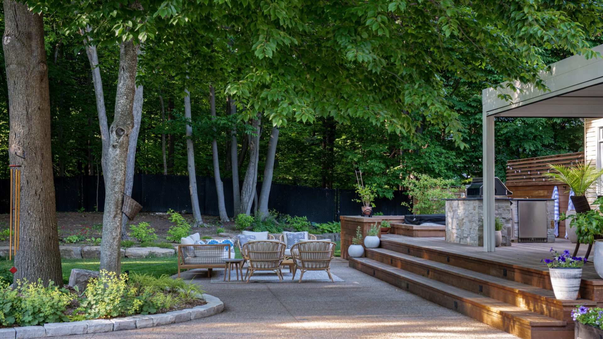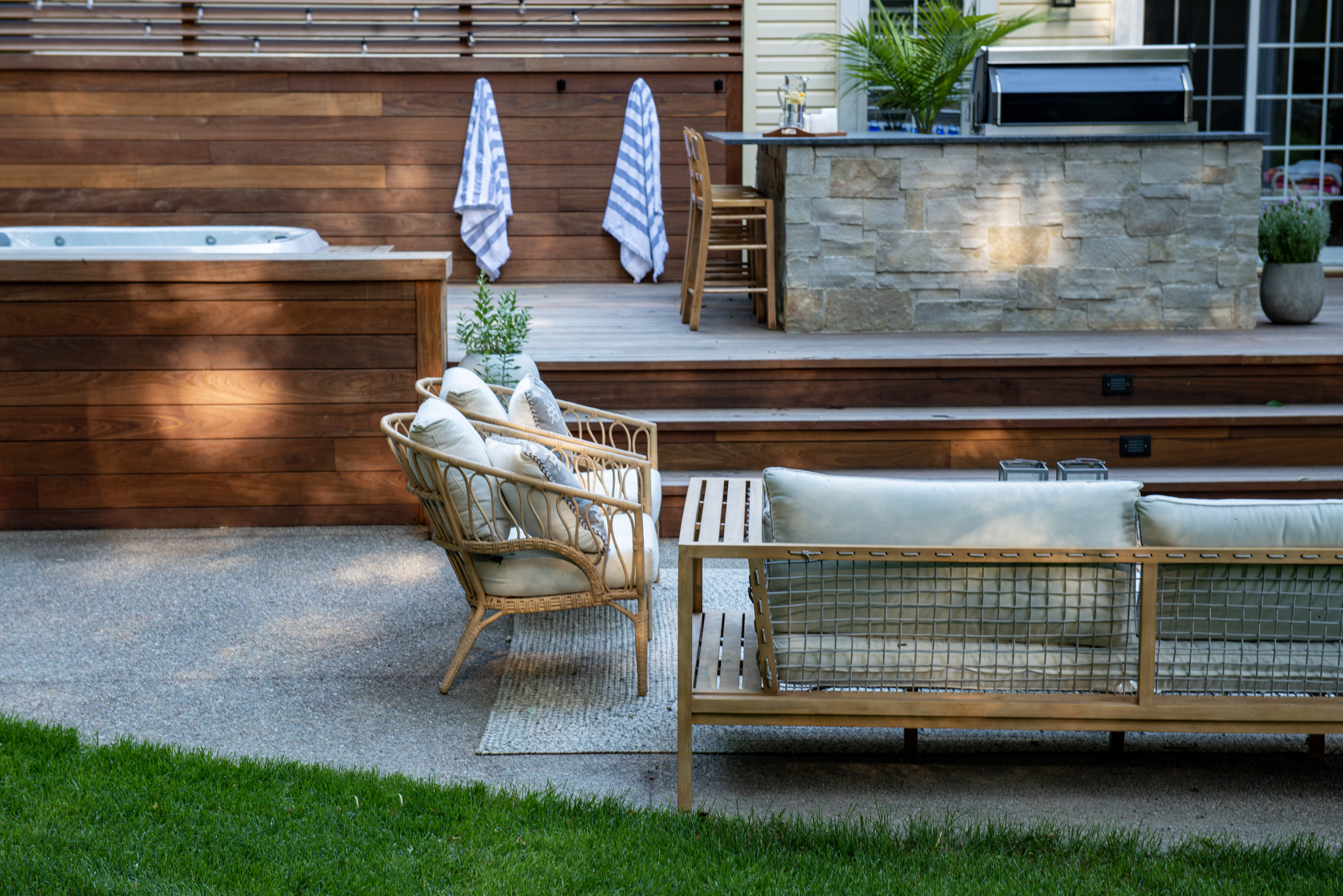 To have the hot tub located on the patio while maintaining privacy, we built an IPE privacy screen and incorporated IPE benches surrounding the area. The patio was equally built in IPE wood which made for a smooth transition from hot tub to dining area. DLC constructed a natural stone outdoor kitchen and island which separated the dining area and the hot tub perfectly.