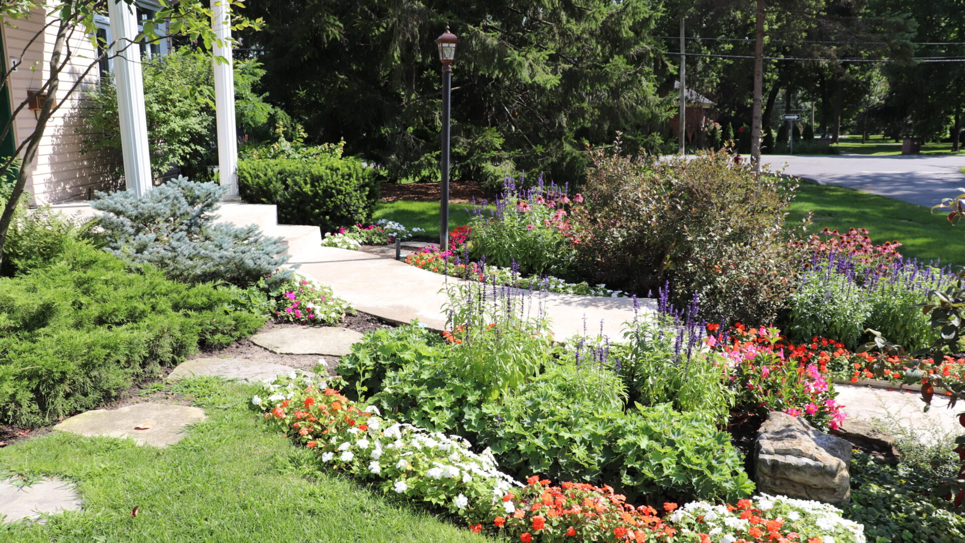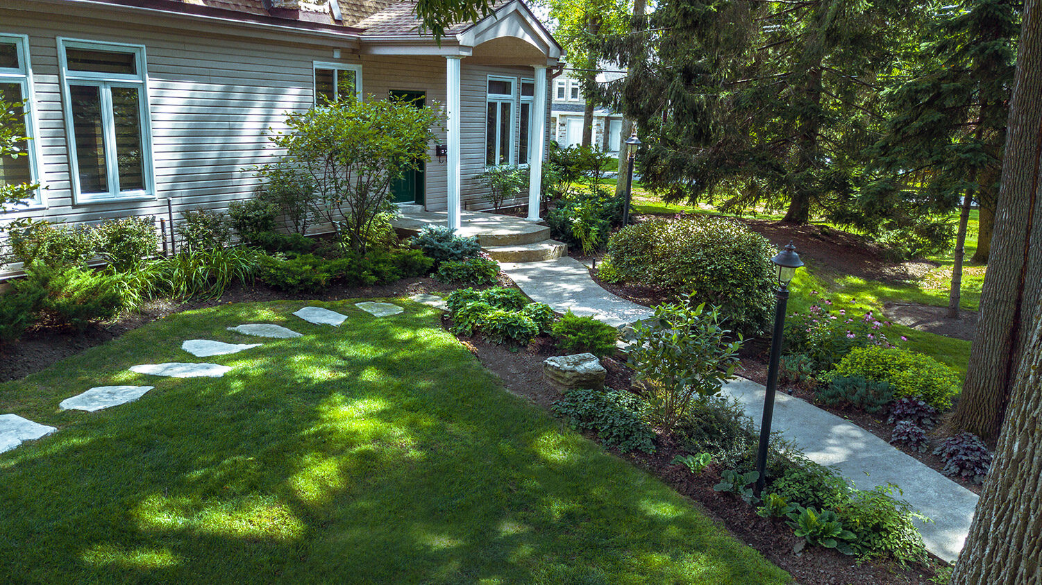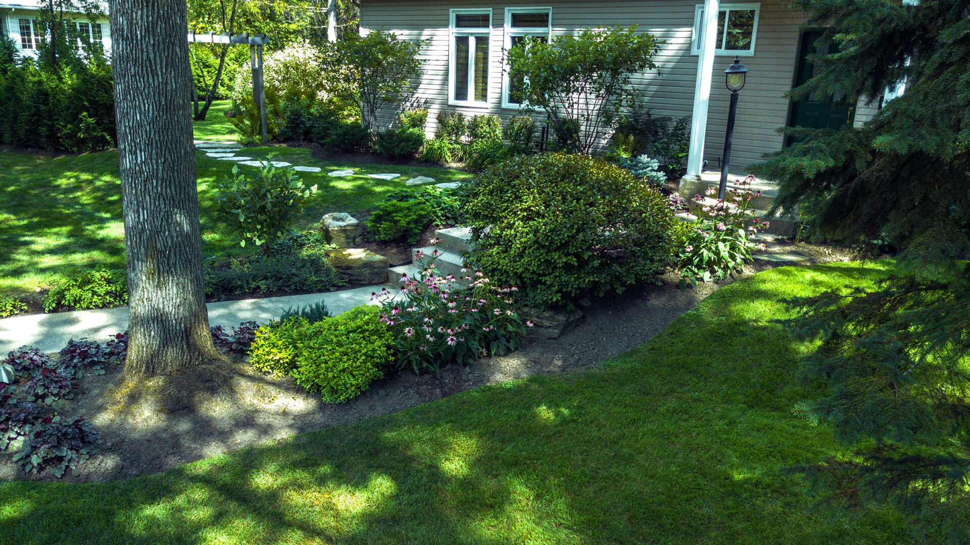 In the season following the construction of the backyard garden, our crews overhauled the front gardens, using the varieties of shrubs and perennials found in the back garden. The selection of similar plant material gives the property a unified look.