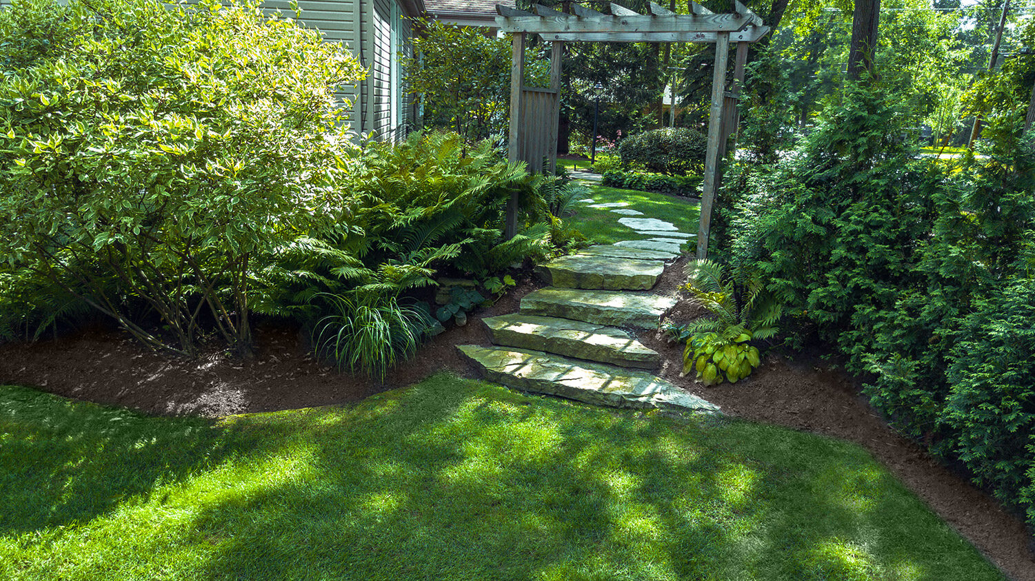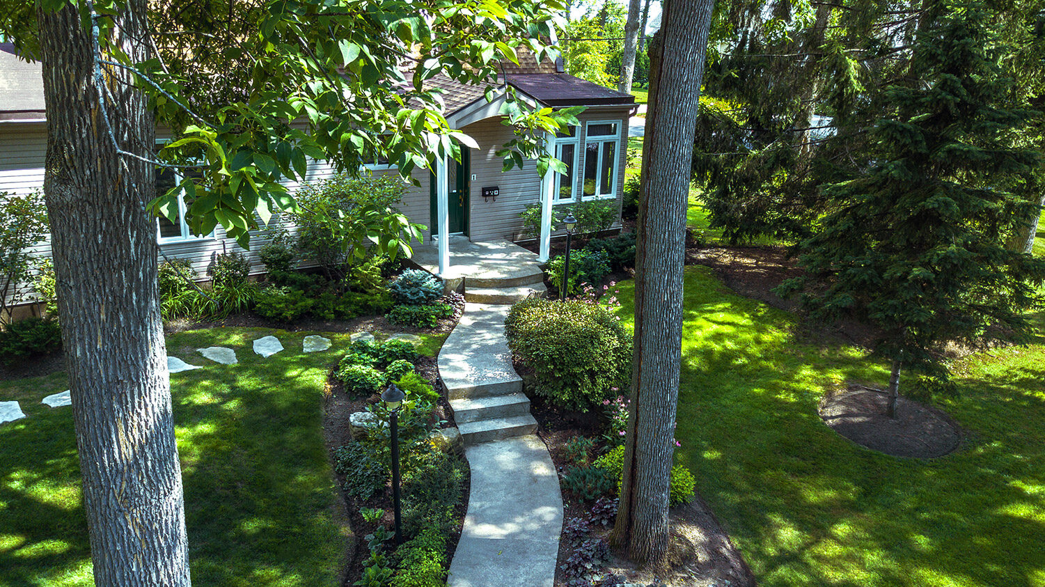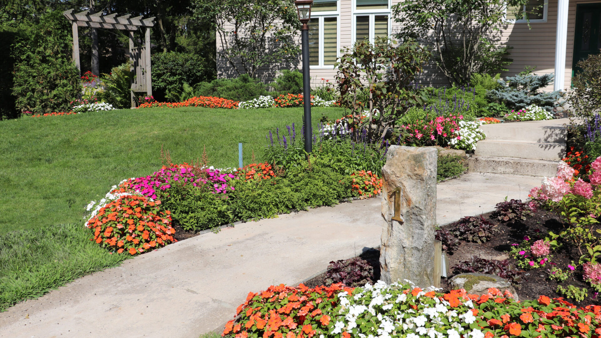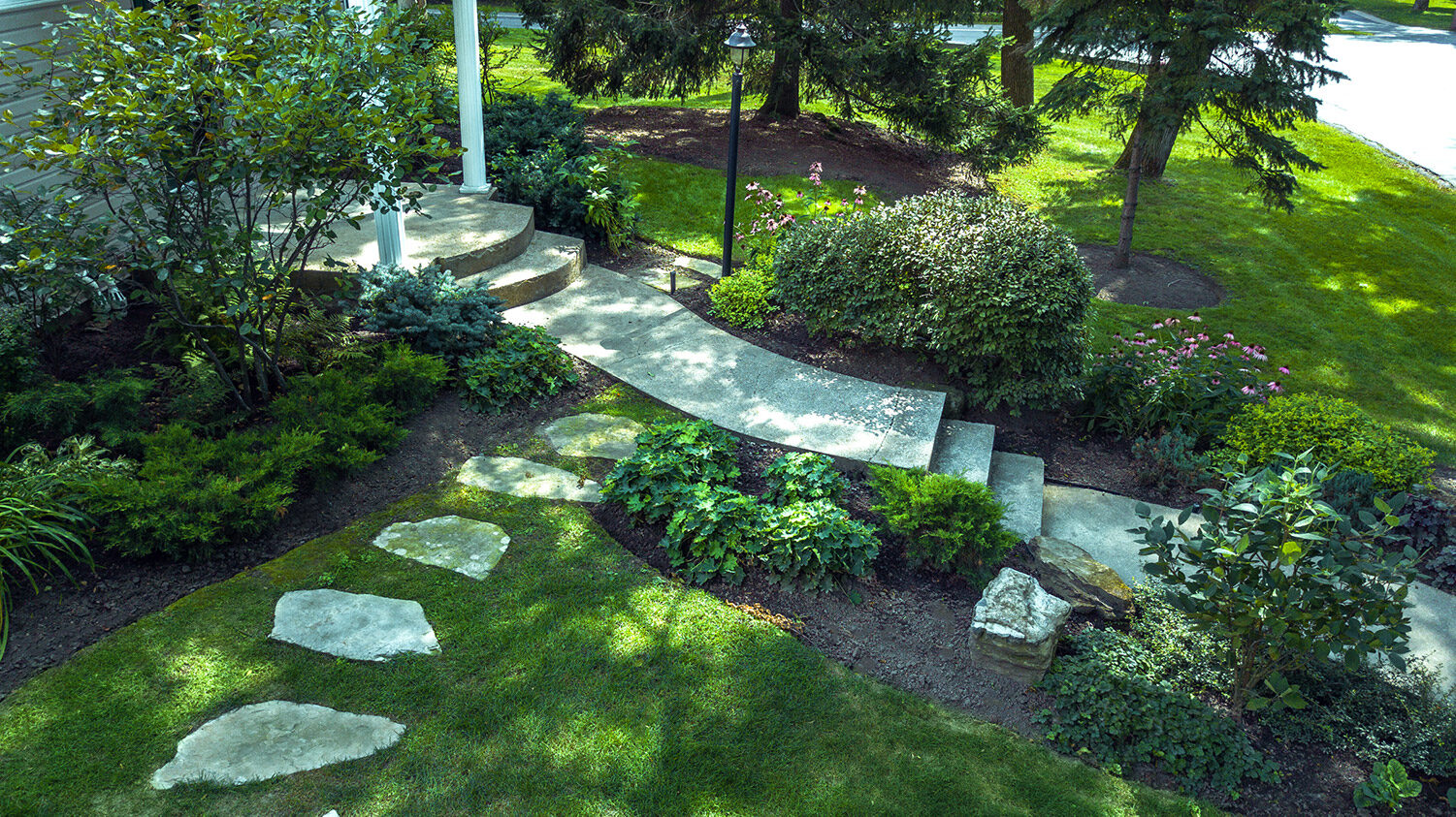 In the season following the construction of the backyard garden, our crews overhauled the front gardens, using the varieties of shrubs and perennials found in the back garden. The selection of similar plant material gives the property a unified look.