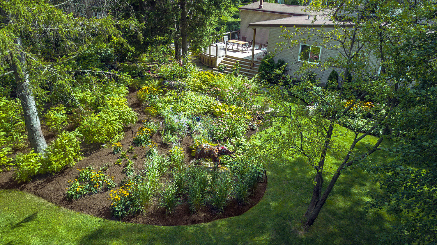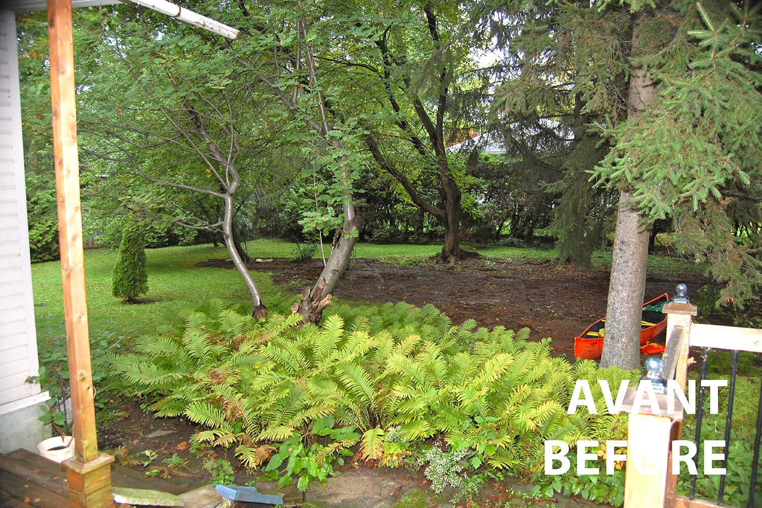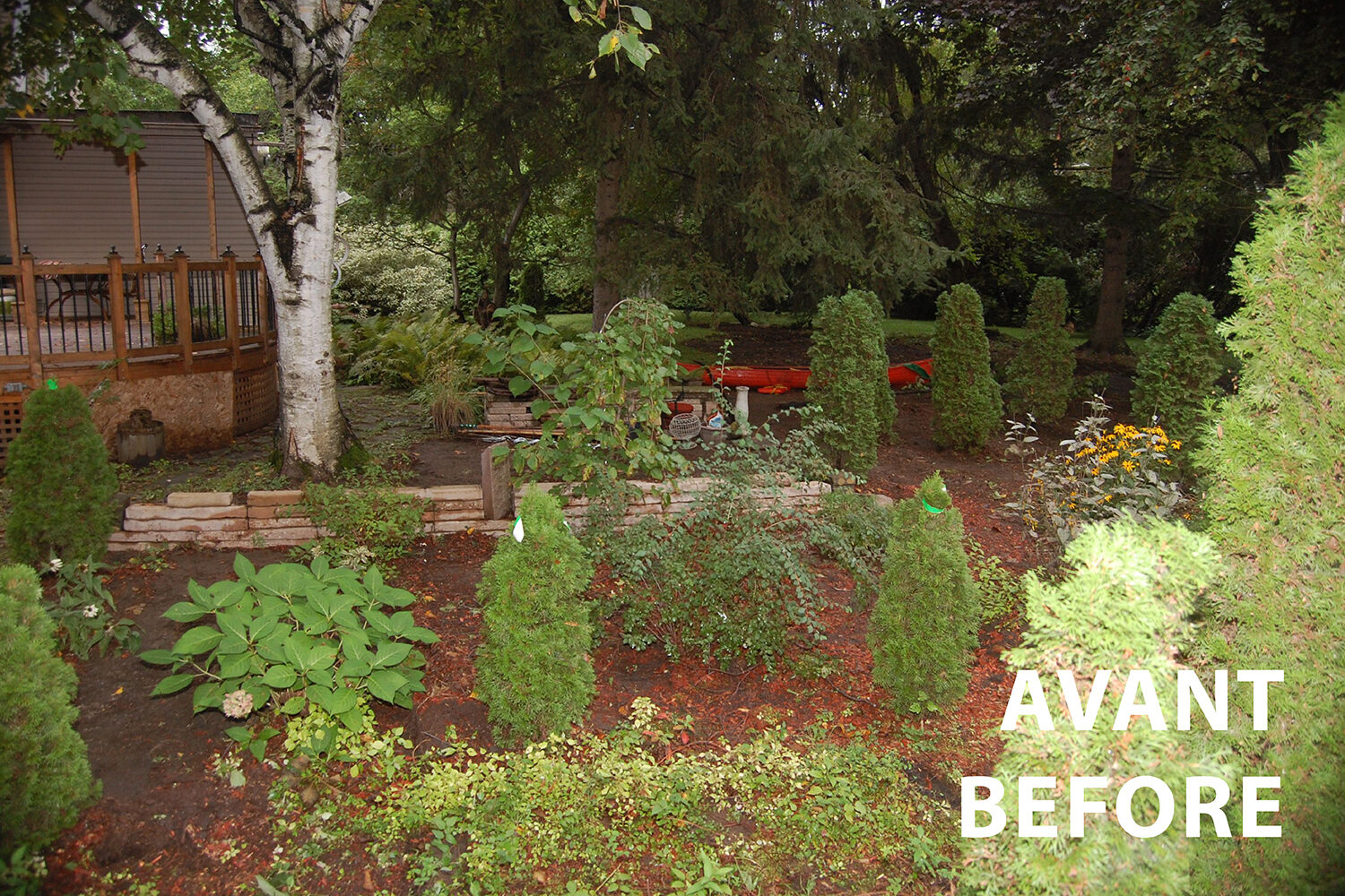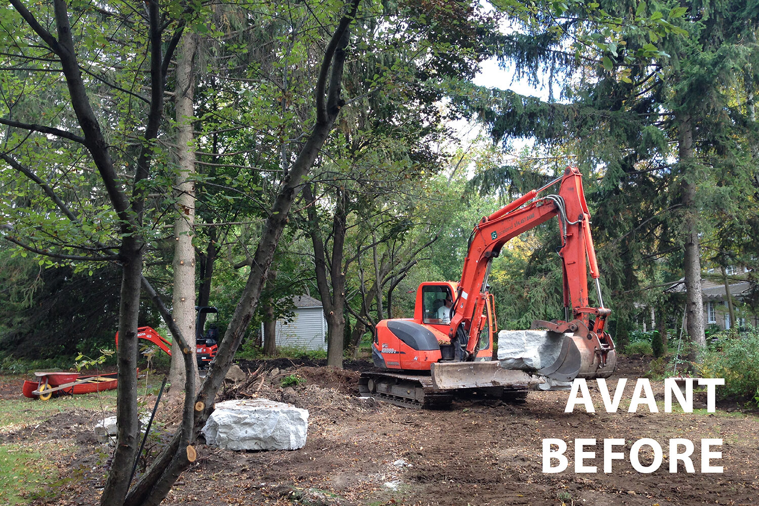 This large Beaconsfield garden is a stark contrast with the site that we were presented with at the beginning of the project. The backyard was completely flat and the lawn was in poor condition due to the shade and acid soil beneath the large evergreens. The owners asked us to create an interesting garden, something that was different for everything else in their neighborhood. The clients did not want to remove the large trees, and growing grass under them was virtually impossible. Planting such a large flat area would have been uninteresting, as the view from the house would have lacked focal points. The solution was to add some contours to the land.
