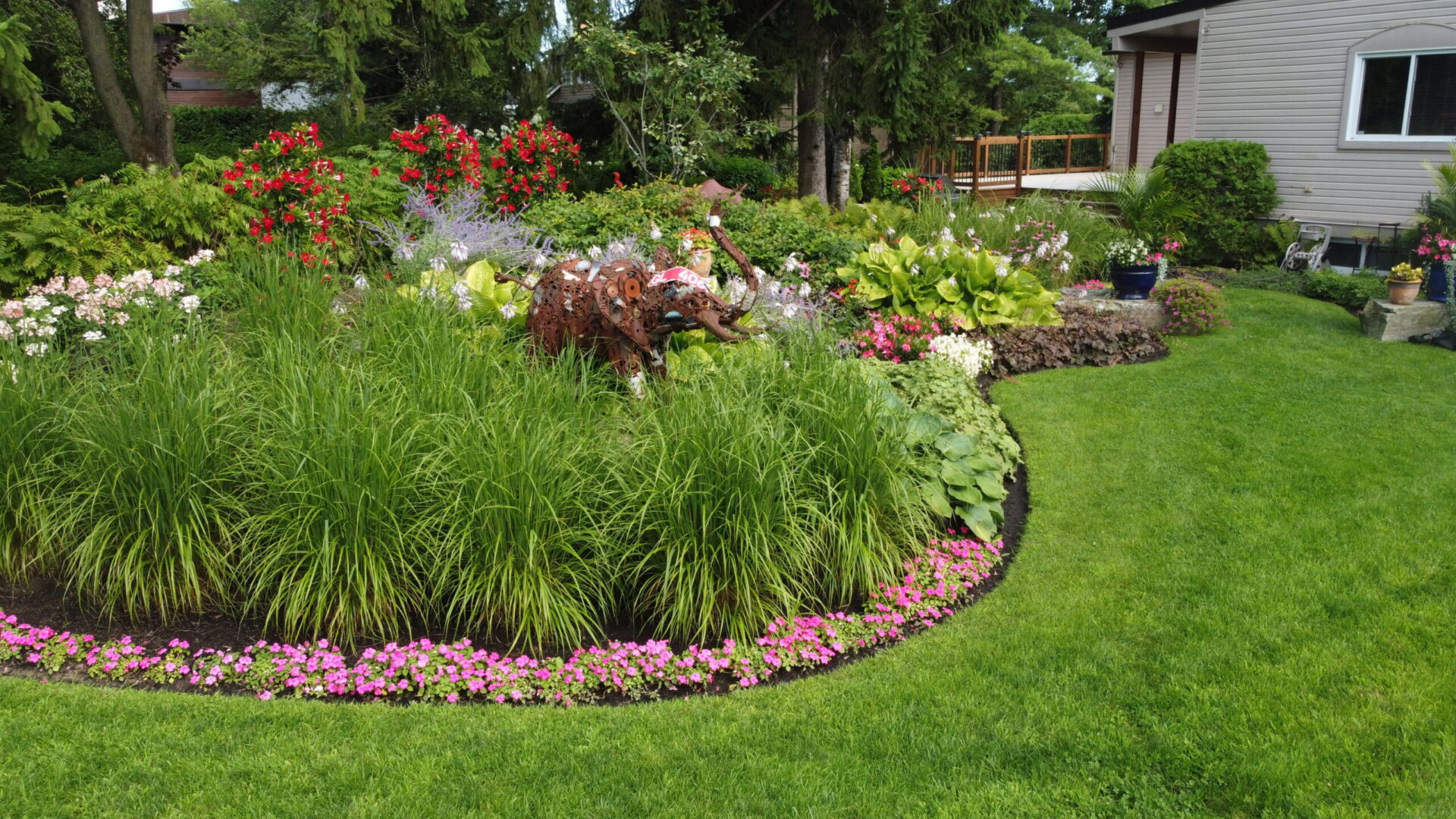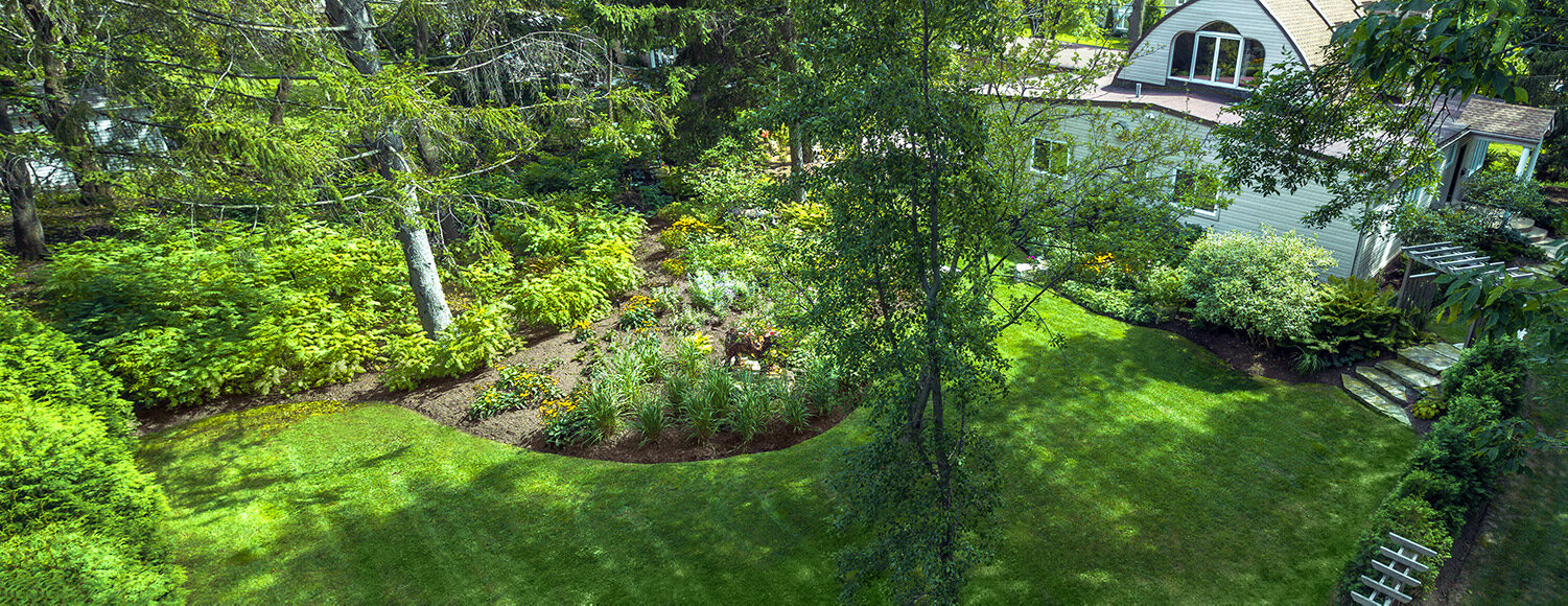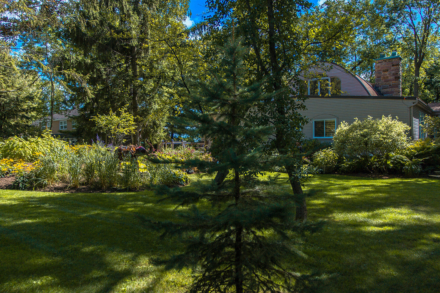 This large Beaconsfield garden is a stark contrast with the site that we were presented with at the beginning of the project. The backyard was completely flat and the lawn was in poor condition due to the shade and acid soil beneath the large evergreens. The owners asked us to create an interesting garden, something that was different for everything else in their neighborhood. The clients did not want to remove the large trees, and growing grass under them was virtually impossible. Planting such a large flat area would have been uninteresting, as the view from the house would have lacked focal points. The solution was to add some contours to the land.