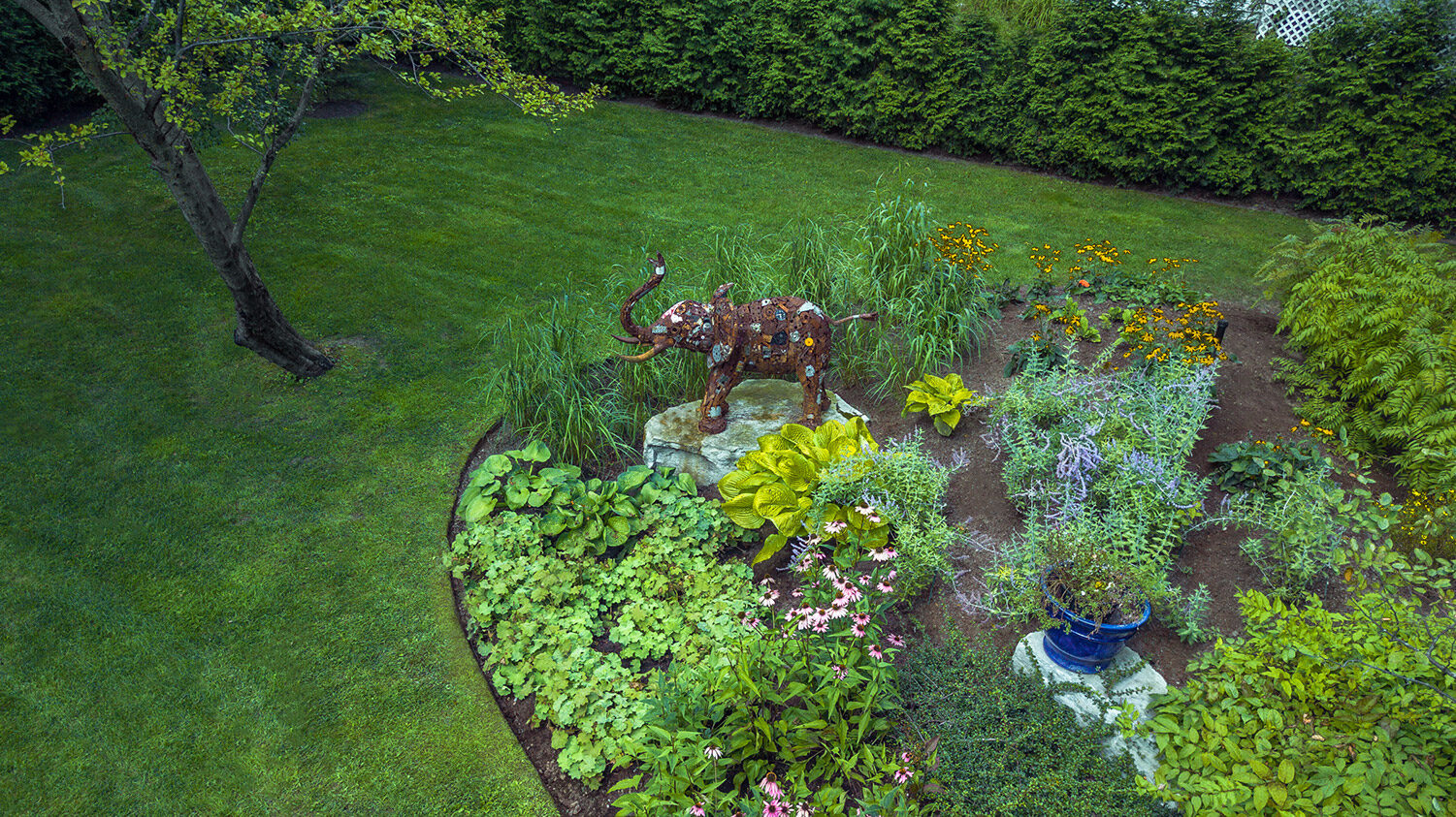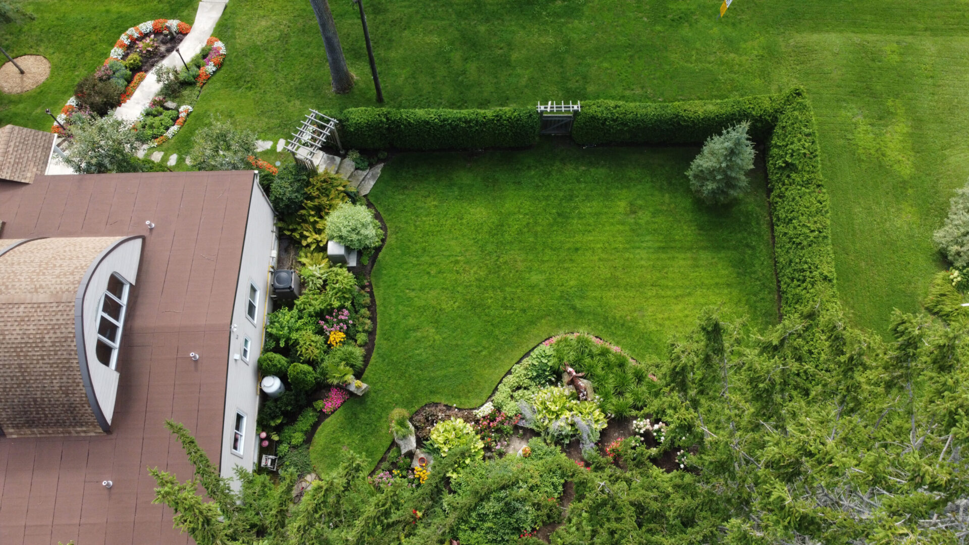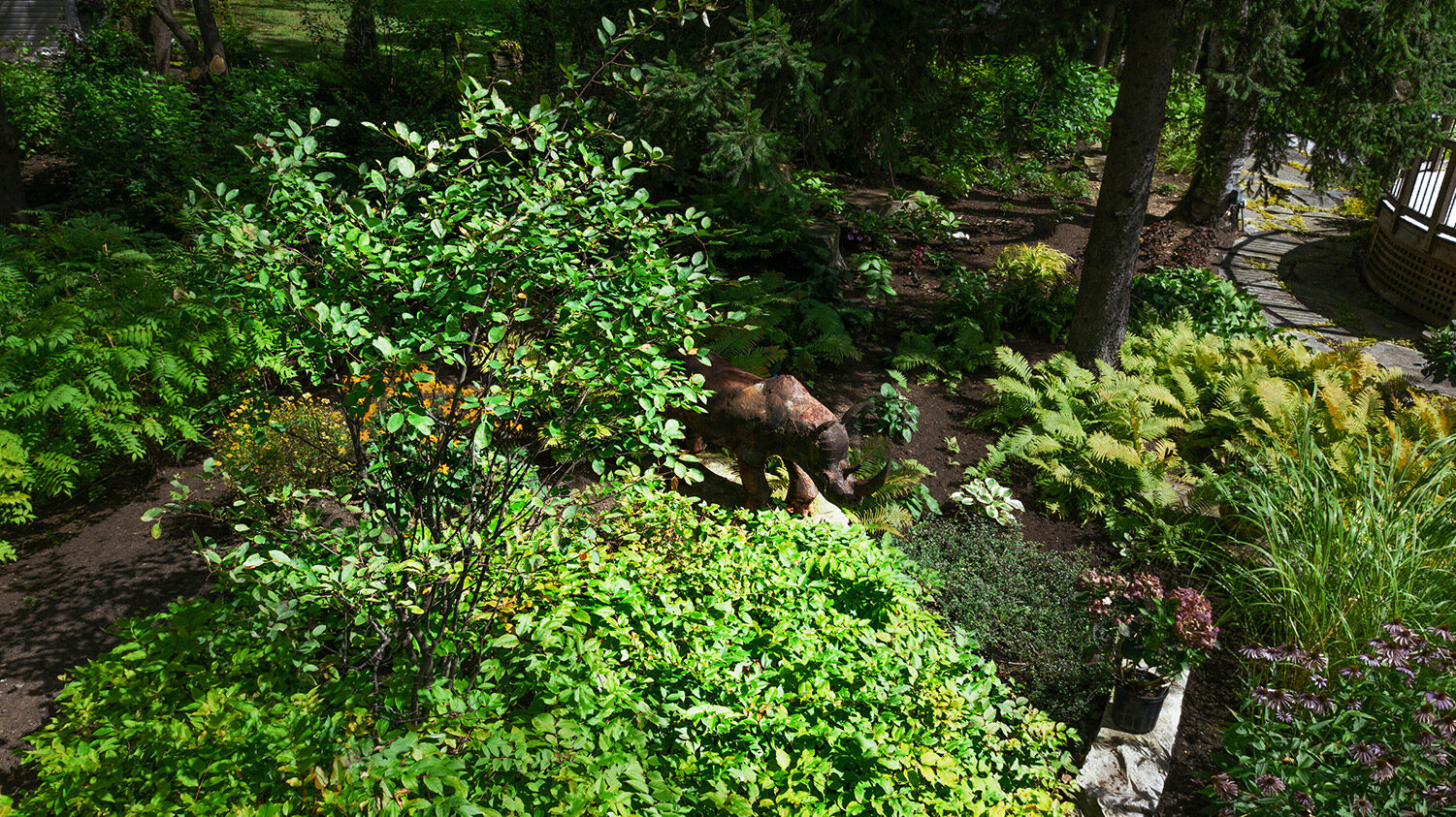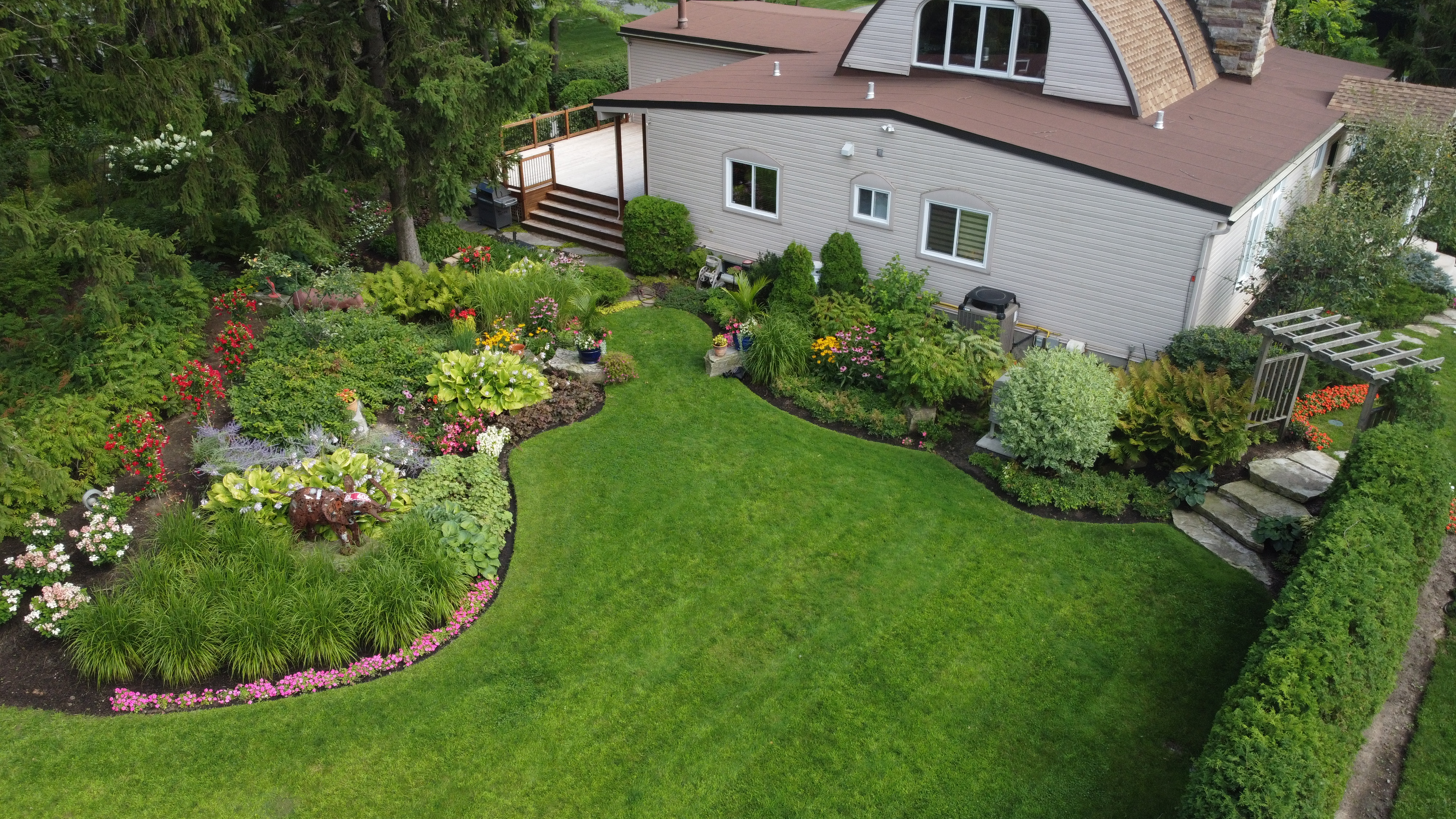 This large Beaconsfield garden is a stark contrast with the site that we were presented with at the beginning of the project. The backyard was completely flat and the lawn was in poor condition due to the shade and acid soil beneath the large evergreens. The owners asked us to create an interesting garden, something that was different for everything else in their neighborhood. The clients did not want to remove the large trees, and growing grass under them was virtually impossible. Planting such a large flat area would have been uninteresting, as the view from the house would have lacked focal points. The solution was to add some contours to the land.